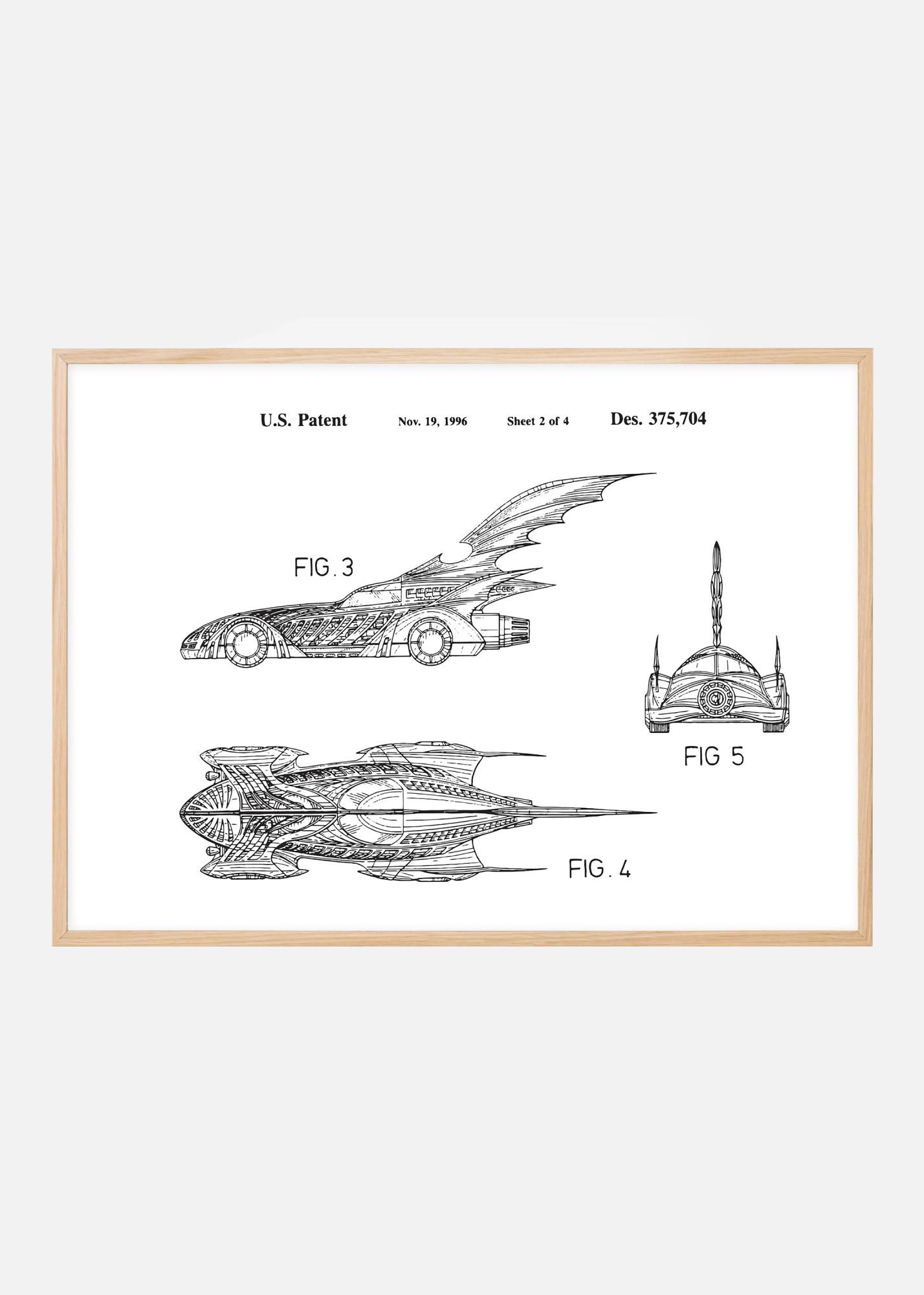 Această posteră unică cu patent prezintă schițe mărețe din brevetul american Des. 375,704, datat pe 19 noiembrie 1996. Această desen brevet artistic adaugă o atmosferă creativă oricărui spațiu, cu reprezentări ale unui vehicul concept care este la fel de mult o operă de artă cât și o minune tehnică. FIG. 3 și FIG. 4 înfățișează o Batmobile în profil și vedere de ansamblu, oferind privitorului o senzație a formei și structurii sale inovatoare, în timp ce FIG. 5 se concentrează pe partea din spate caracteristică și trăsăturile ei unice.