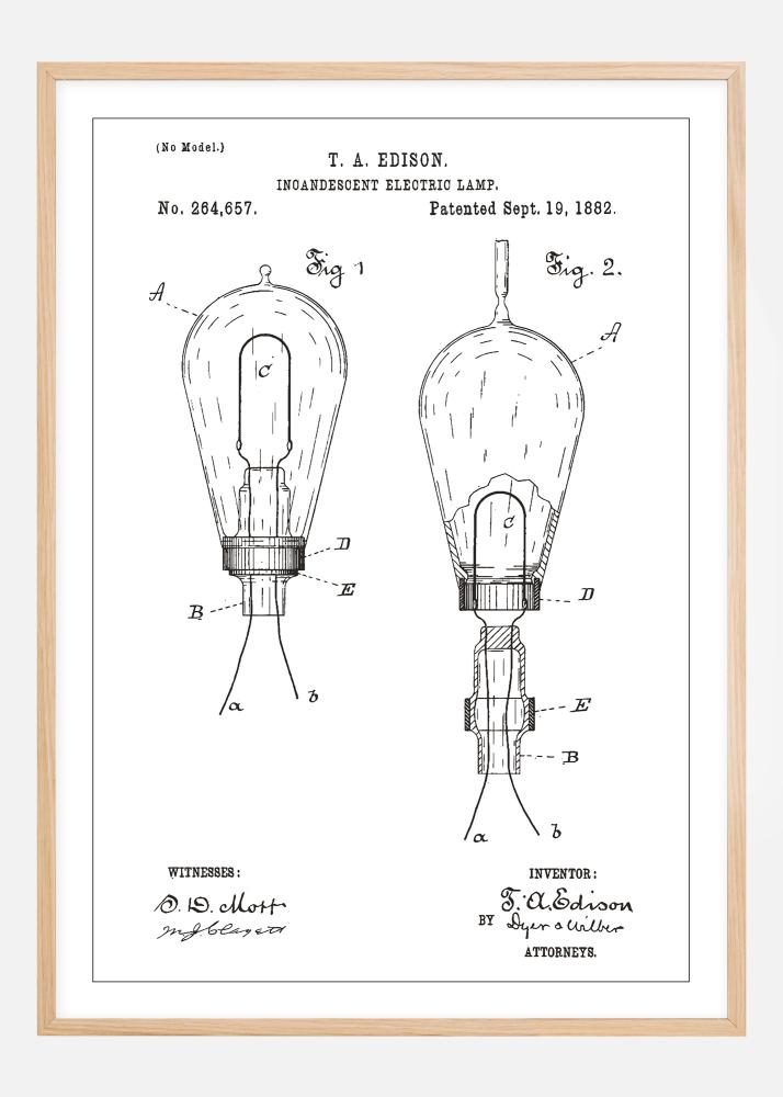 Această afișă patentată special dezvăluie frumusețea designului lămpii cu incandescență al lui T. A. Edison, care a modelat lumea modernă prin numărul de brevet 264.657, acordat la 19 septembrie 1882. Ilustrația detaliată evidențiază aspectele tehnice ale unei versiuni timpurii a lămpii cu incandescență, care a fost una dintre primele lămpi comercializate cu succes. Această afișă patentată este un omagiu perfect adus unuia dintre cei mai influenți inventatori din toate timpurile și contribuția sa la iluminatul electric.