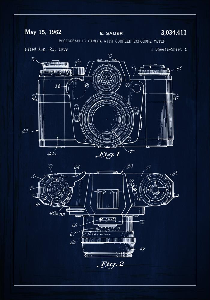 Această poster patentat elegantă ilustrează un desen detaliat al unei camere fotografice cu un măsurător de expunere conectat, numărul de patent 3,034,411, datat 15 mai 1962. Patentul, depus de E. Sauer la 21 august 1959, prezintă o reprezentare detaliată a mecanicii sofisticate a camerei și a designului său estetic atractiv. Ilustrațiile tehnice din acest desen patent arată vederi de sus și din față ale camerei, precum și secțiunea sa de bază, oferind o imagine cuprinzătoare a construcției și funcționalității sale.