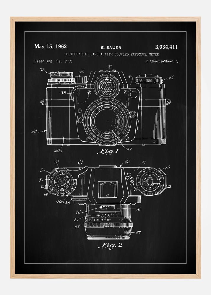 Această poster de brevet prezintă o cameră foto cu un fotometru conectat, care a obținut brevetul pe 15 mai 1962 sub numărul 3,034,411. Inventatorul, E. Sauer, a depus brevetul pe 21 august 1959. Desenul detaliat arată partea din față și partea superioară a camerei într-o vedere frontală, precum și o perspectivă inferioară care arată baza camerei și obiectivul. Precizia tehnică și designul bine gândit care apar în aceste ilustrații reflectă o epocă de inovație fotografică și creativitate.