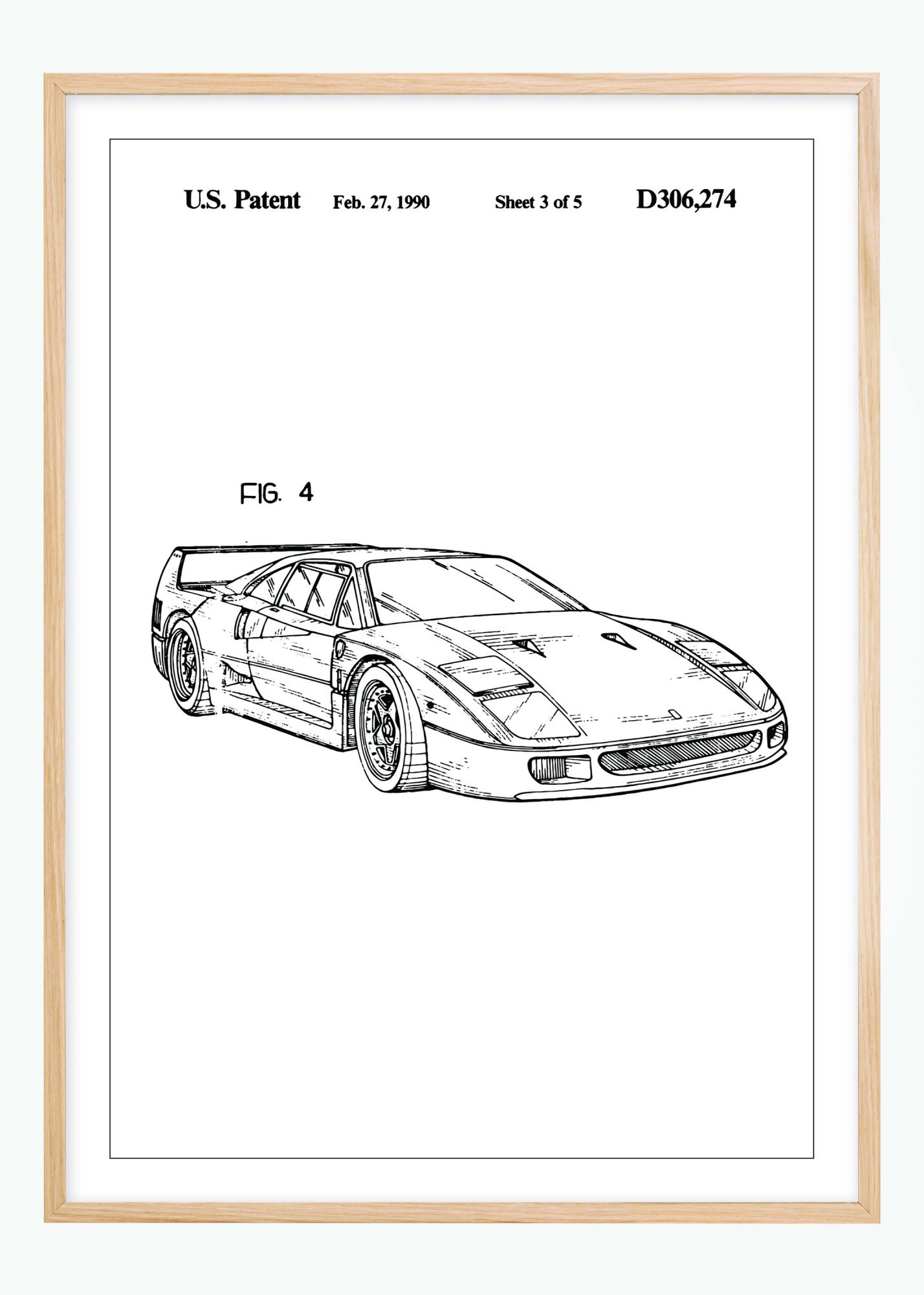 Această poster cu patent prezintă un design inovator al unui Ferrari F40, detaliat realizat pe 27 februarie 1990, sub numărul de patent D306,274. Ilustrația arată o parte din ceea ce avea să devină una dintre cele mai iconice mașini sport din istorie, cunoscută pentru aerodinamica sa și stilul său distinctiv. Este o imagine a inovației și progresului în industria auto, care atrage privirea spectatorului cu liniile sale clare și forma sa dinamică.