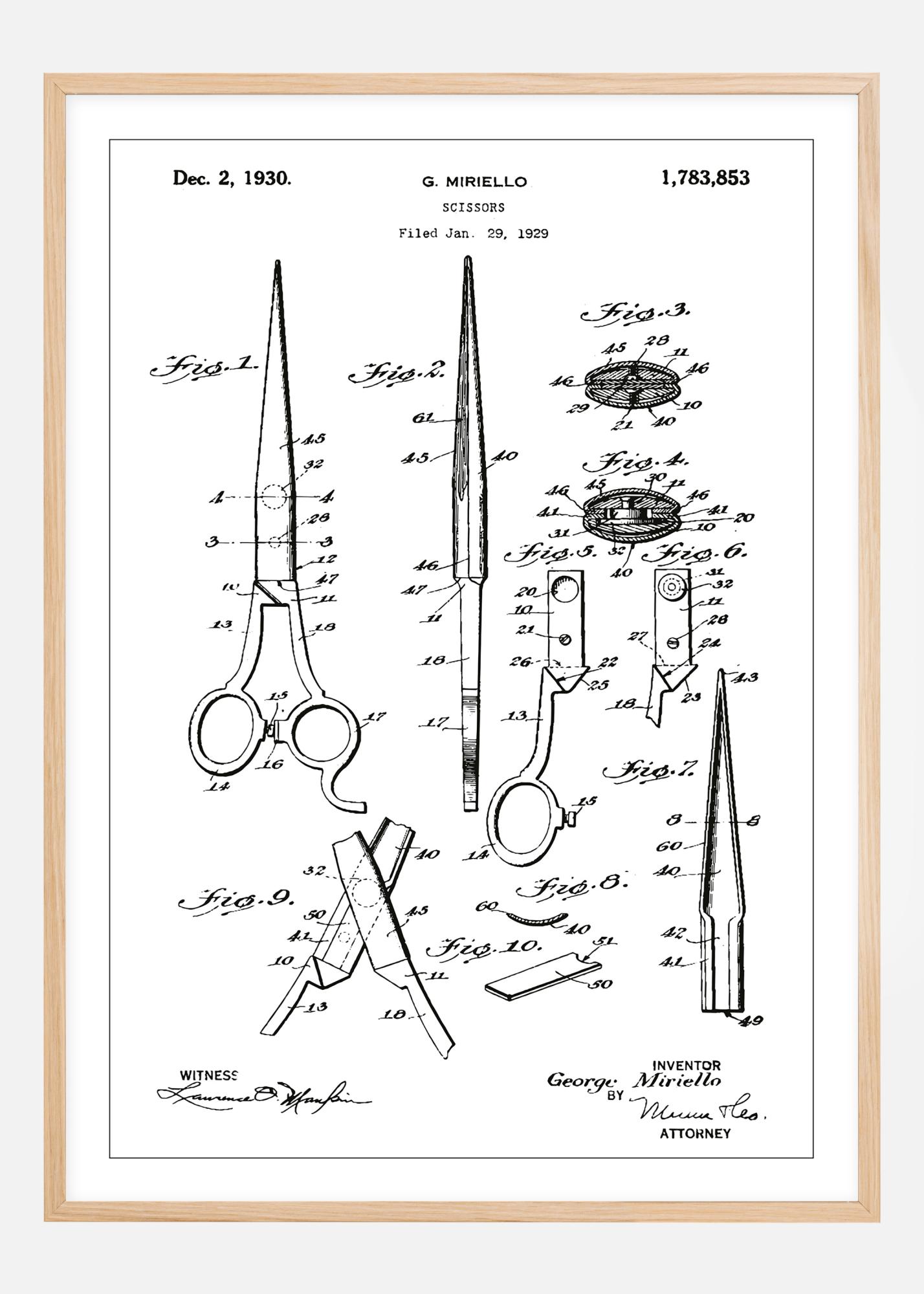 Elegantă și instructivă, acest poster de patent descrie designul inovator al foarfecelor realizat de G. Mirello, brevetat pe 2 decembrie 1930 sub numărul 1,783,853. Este o privire educativă asupra dezvoltării unui instrument de la începutul secolului XX, de la lamele tăiate cu precizie la brațele artistic conturate. Fiecare detaliu al desenului de brevet este realizat cu precizie, demonstrând expertiza tehnică și abilitatea de design care caracterizau invențiile acelei epoci.