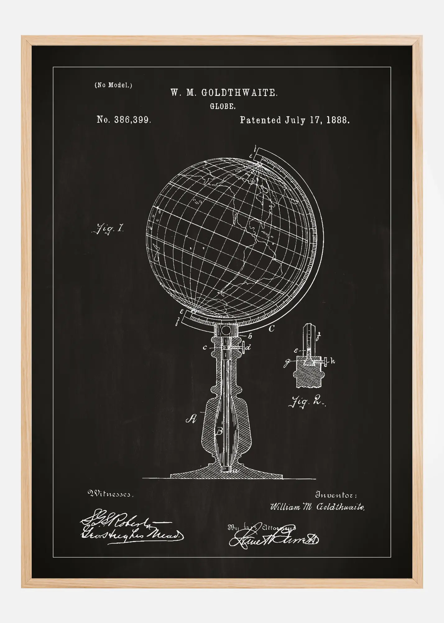Această poster de brevet prezintă designul clasic al unui glob pământesc realizat de W. M. Goldthwaite, o creație detaliată perpetuată prin numărul de patent 386.399 pe 17 iulie 1888. Posterul capturează eleganța invenției și frumusețea sa funcțională, ilustrând lumea în două dimensiuni într-un mod care inspiră descoperiri și explorări. Liniile sale precise și claritatea designului fac din aceasta un excelent instrument pedagogic și un element decorativ dorit pentru oricine apreciază geografia și istoria mondială.