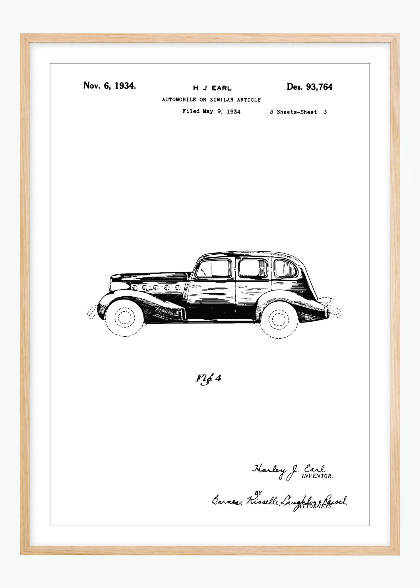 Această schiță de brevet ilustrează o mașină, brevetată de H.J. Earl la 6 noiembrie 1934 sub numărul de brevet Des. 93,764. Invenția se referă la o mașină sau un articol similar, așa cum s-a indicat în cererea depusă pe 9 mai 1934. Desenul prezintă o vedere laterală a vehiculului, oferind o înțelegere clară a designului și proporțiilor sale caracteristice pentru acea perioadă.