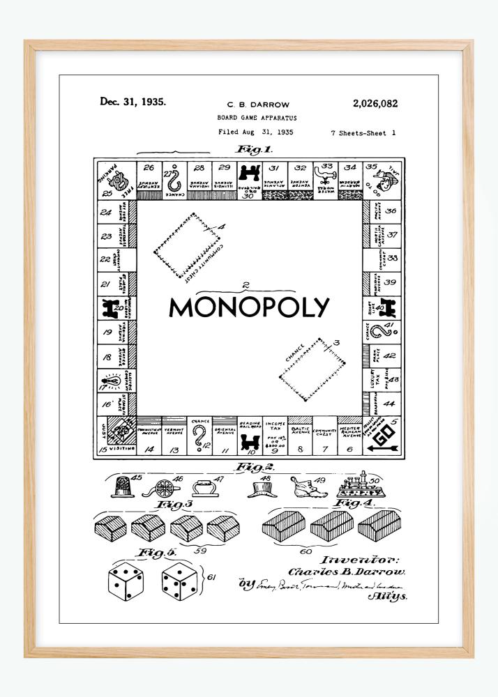Această afișă de brevet ilustrează designul clasic al jocului de societate iubit Monopoly, un simbol cultural în divertismentul familial și în jocuri. Datele arată că inventatorul Charles B. Darrow a depus cererea de brevet la 31 august 1935, iar acesta a fost acordat pe 31 decembrie același an cu numărul 2,026,082. Desenul detaliat prezintă o vedere de ansamblu a tabloului de joc, complet cu binecunoscutele casete "start", "șansă" și proprietăți, precum și piesele de joc și zarurile iconice, oferind o senzație de nostalgie și apreciere pentru acest joc atemporal.