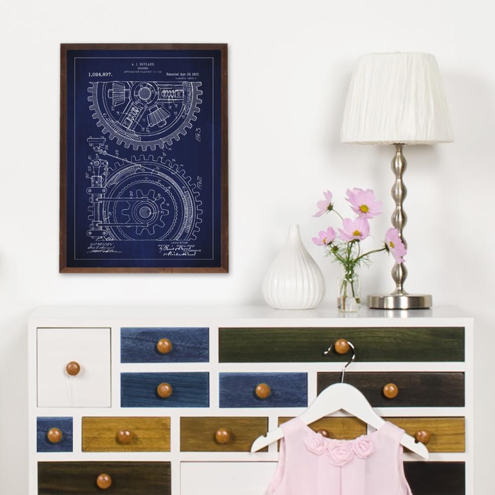Decorați-vă spațiul cu acest poster elegant de brevet care descrie în detaliu invenția mecanismului de cutie de viteze de către A. I. Hovland, brevet numărul 1,024,897, acordat la 30 aprilie 1912. Această lucrare complicată de desen tehnic evidențiază o epocă de inovație și construcție mecanică. Cu contrastul său îndrăzneț și ilustrațiile complexe, aceasta este un adaos încântător pentru biroul unui inginer, un atelier sau orice mediu industrial unde mașinile și designul sunt foarte apreciate.