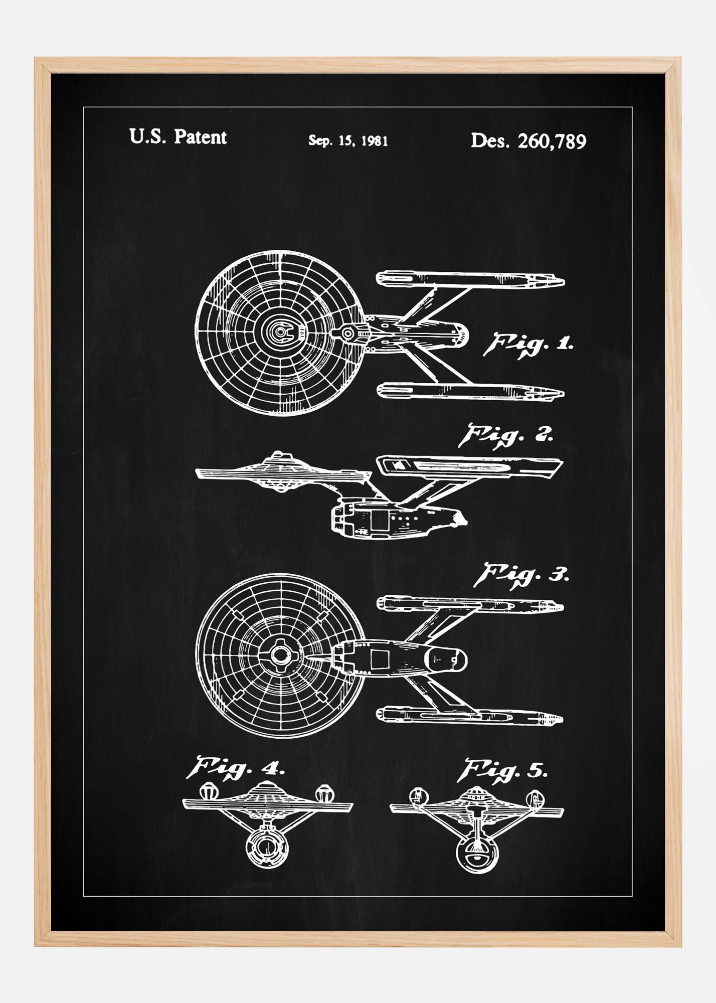 Această poster patent prezintă un concept de design iconic pentru nava spațială Enterprice din Star Trek, datată 15 septembrie 1981 cu numărul de patent Des. 260,789. Este o reprezentare stilizată care evocă aventuri science fiction și călătorii interstelare. Ilustrațiile detaliate redau forma navei din diferite unghiuri și perspective, evidențiind atât simetria sa, cât și structurile sale complexe. Această schiță de patent combină uimirea științifică și plăcerea estetică, fiind un excelent punct de discuție care aduce un element de inovație și viziune asupra viitorului în orice mediu.