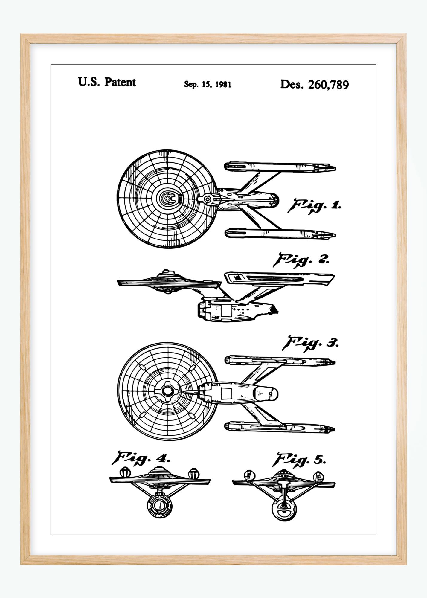 Această poster cu brevet prezintă un desen detaliat al Enterprise din StarTrek, brevet acordat la 15 septembrie 1981 sub numărul Des. 260,789. Cele cinci figuri ilustrează ventilatorul din diferite unghiuri, oferind o vedere cuprinzătoare asupra construcției și designului său. Desenele subliniază structura tehnică și designul estetic al acestui aparat de uz casnic.