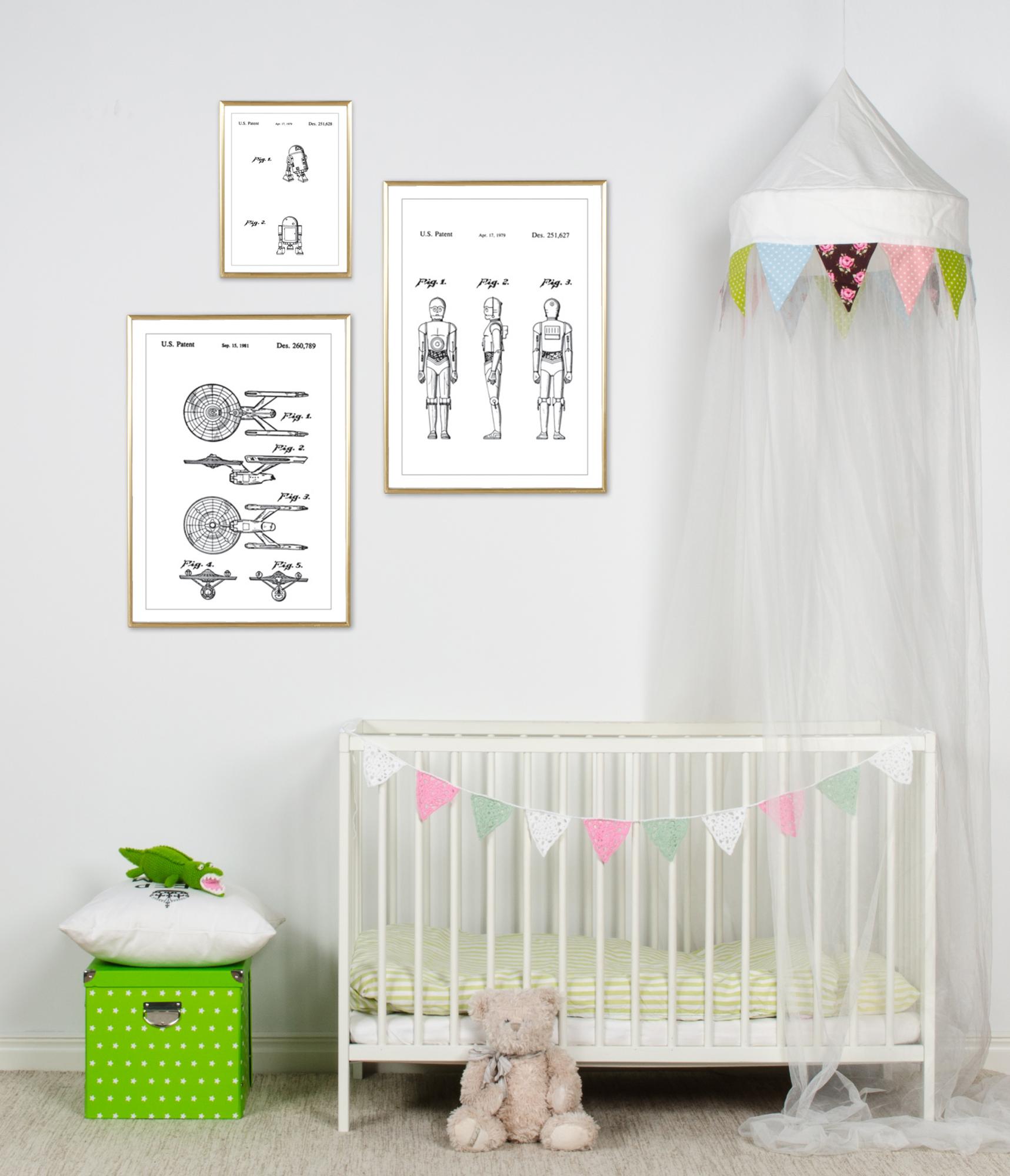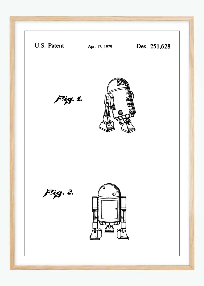 Această poster fascinant cu patent capturează esența retrofuturismului cu un design pentru un R2D2 din StarWars, reflectând viziunea perioadei asupra tehnologiei viitorului. Cu un patent american datat pe 17 aprilie 1979, sub numărul de înregistrare Des. 251,628, acest motiv ilustrează două perspective ale unei figuri robot iconice, un profil complet și o vedere frontală. Este un desen de patent atemporal care este atât un omagiu, cât și o documentație a progreselor din tehnologia robotică de la sfârșitul secolului al XX-lea și a influenței sale în cultura populară.