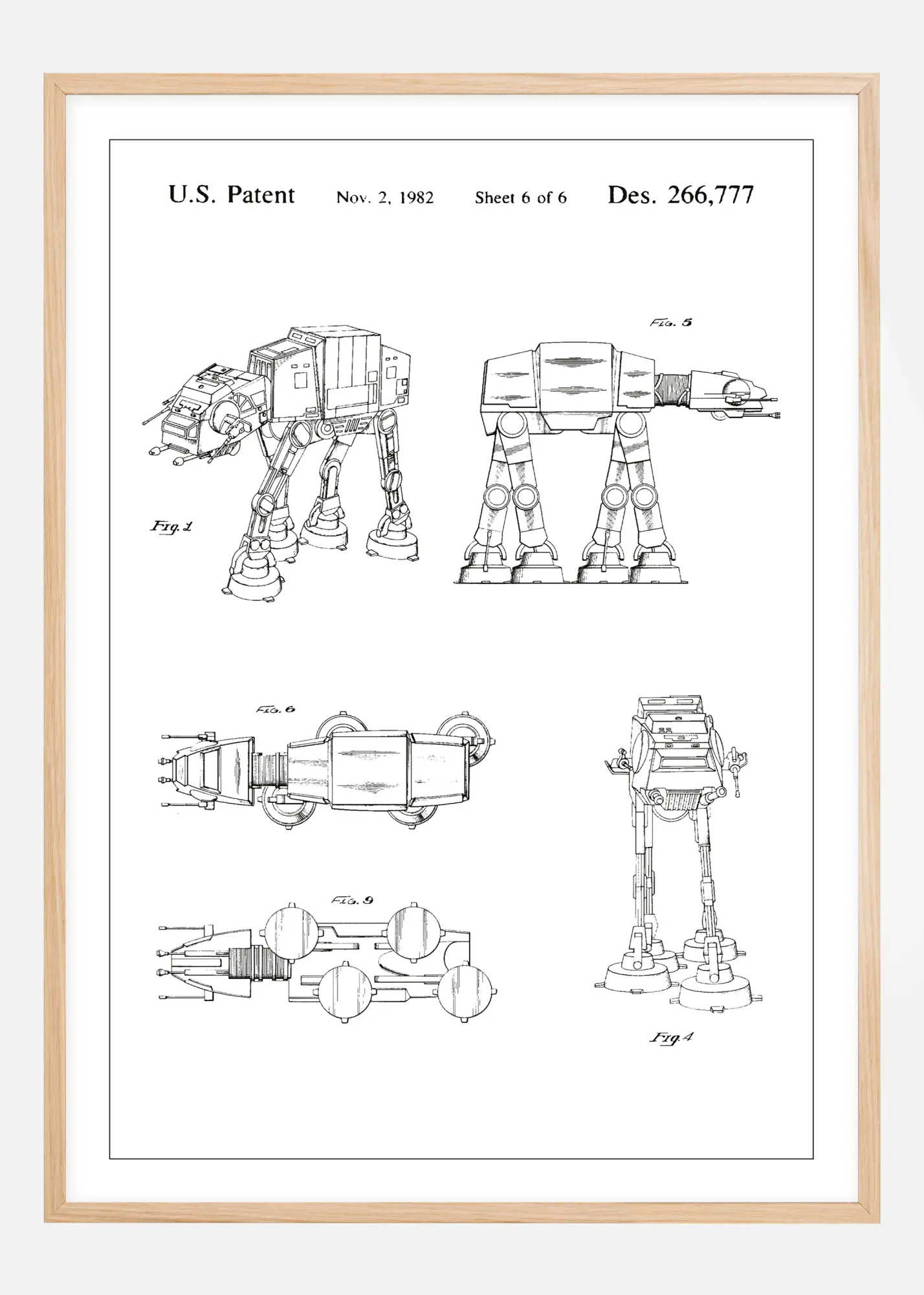 Această poster elegant de brevet este o reproducere creativă a brevetului de design Des. 266,777, înregistrat pe 2 noiembrie 1982. Prezintă schițe detaliate ale unui ATAT din Star Wars și oferă fiecărui privitor o apreciere mai profundă a complexității și preciziei din spatele acestei realizări tehnice. Aceste desene de brevete nu sunt doar intelectual stimulante, ci și opere de artă stilate care aduc un farmec industrial fiecărei camere.