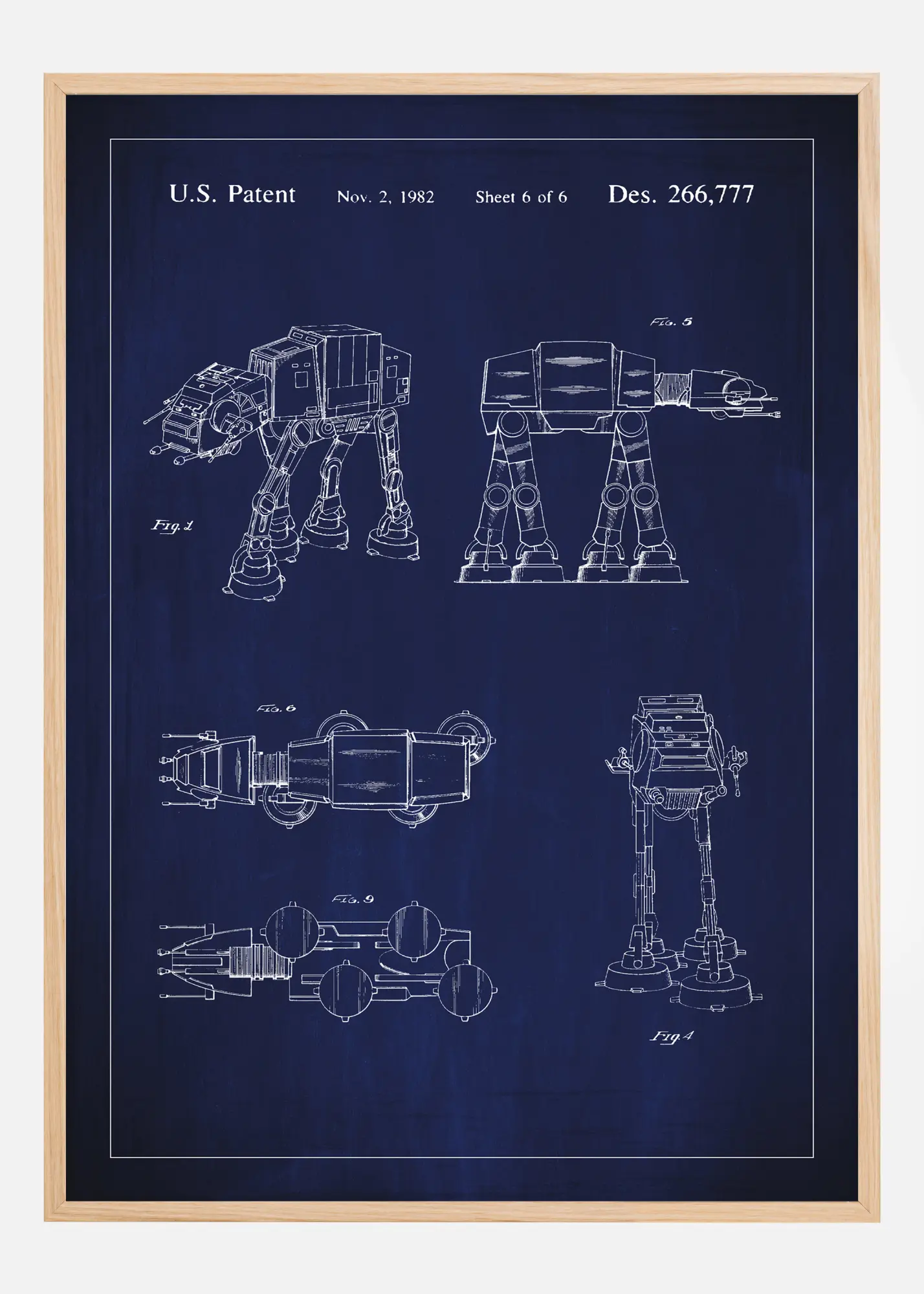 Această poster patent artistic descrie desenele de construcție distincte ale celebrului brevet de design Des. 266,777, înregistrat pe 2 noiembrie 1982. Motivul prezintă desene tehnice ale unui ATAT din Star Wars în mai multe vederi, fiecare demonstrând structura și funcțiile unice ale dispozitivului. Este prezentată pe un fundal albastru profund, oferind o expresie elegantă și modernă ilustrațiilor albe.