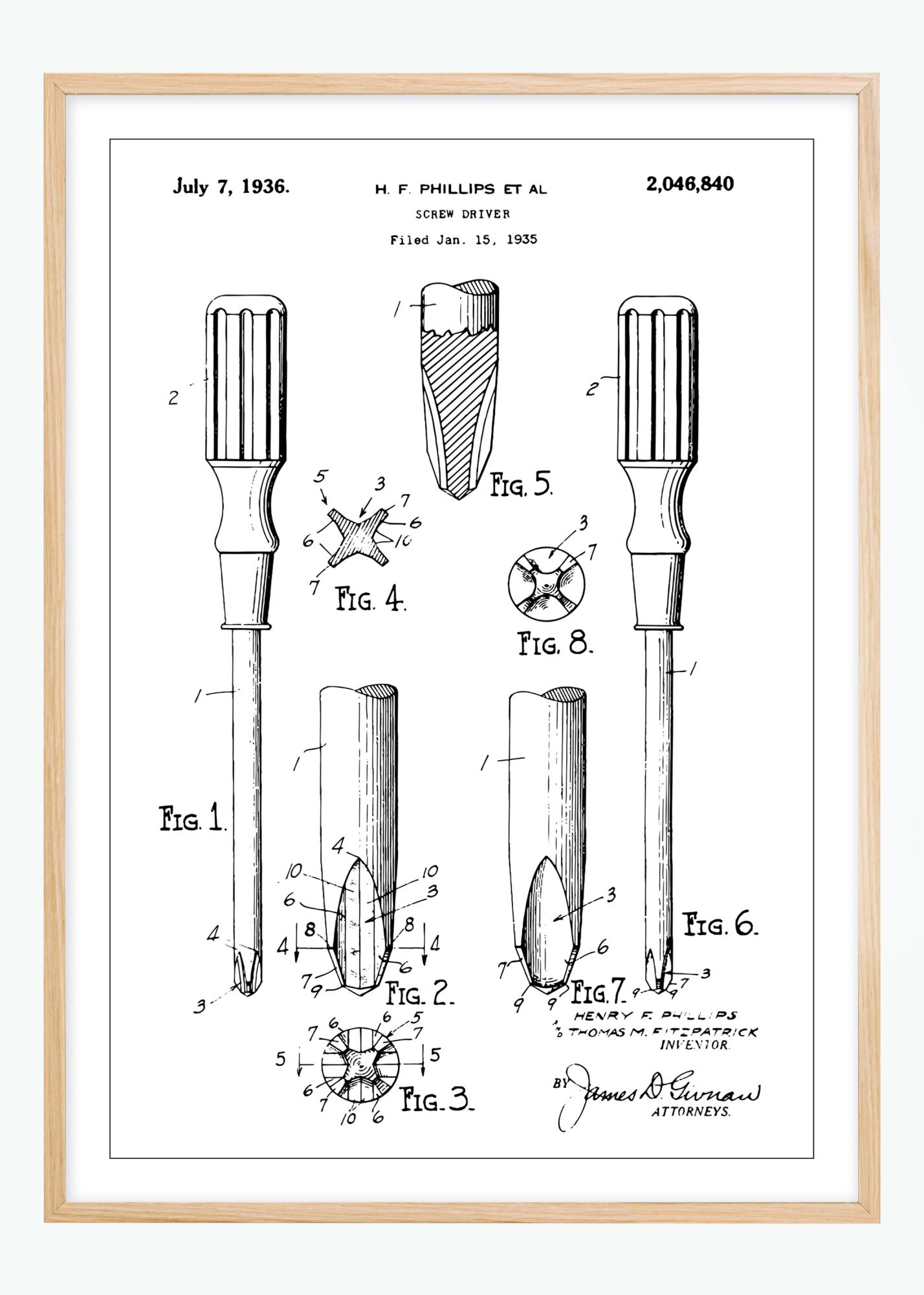 Prezentat aici este un afiș clasic de brevet care ilustrează designul unei șurubelnițe, un clasic indispensabil în fiecare cutie de unelte a unui meșter. Datat la 7 iulie 1936 și arhivat la 15 ianuarie 1935, acest poster de brevet arată cu detalii precise construcția și inovația din spatele uneltei, de la mânerul său iconic până la forma unică a vârfului. Inventatorii H.F. Phillips și alții au creat prin acest brevet, numărul 2,046,840, un standard în industria uneltelor pe care ne bazăm și astăzi.