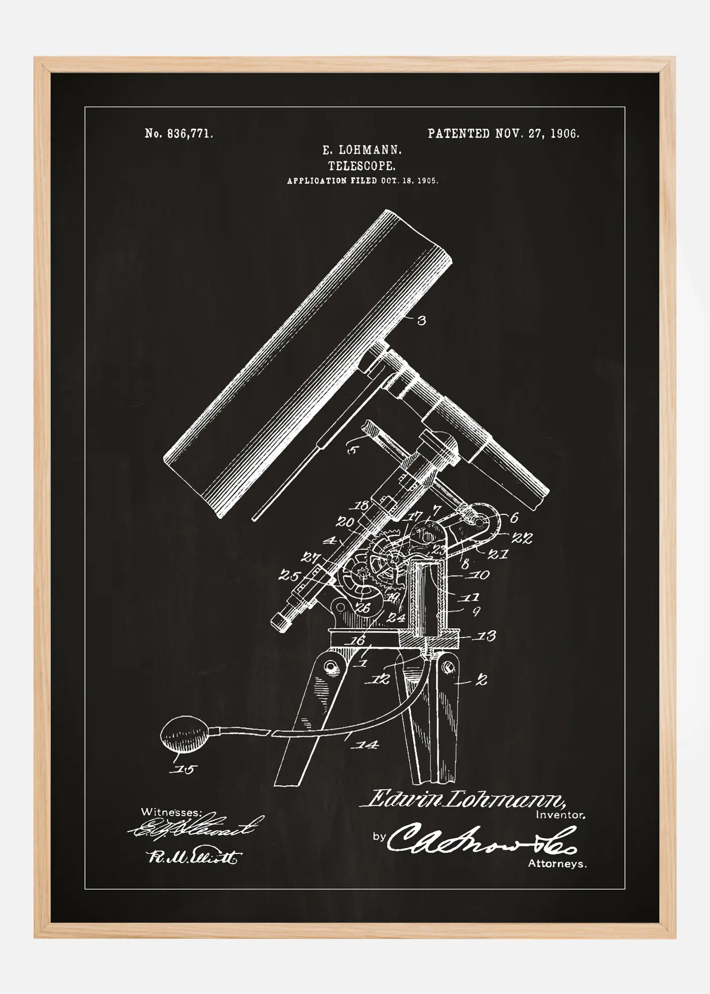 Această poster cu brevet detaliat prezintă telescopul lui E. Lohmann, brevetat pe 27 noiembrie 1906, cu numărul de brevet 836,771. Ilustrația capturează mecanica complexă a telescopului și detaliile fine cu o precizie atentă. Contrastul îndrăzneț al posterului între liniile intricate și fundalul întunecat îl transformă într-un element de decor atrăgător care onorează istoria bogată a astronomiei și opticii. Este un omagiu fascinant adus progreselor științifice de la începutul secolului XX și un punct de inspirație pentru toți entuziaștii științei.