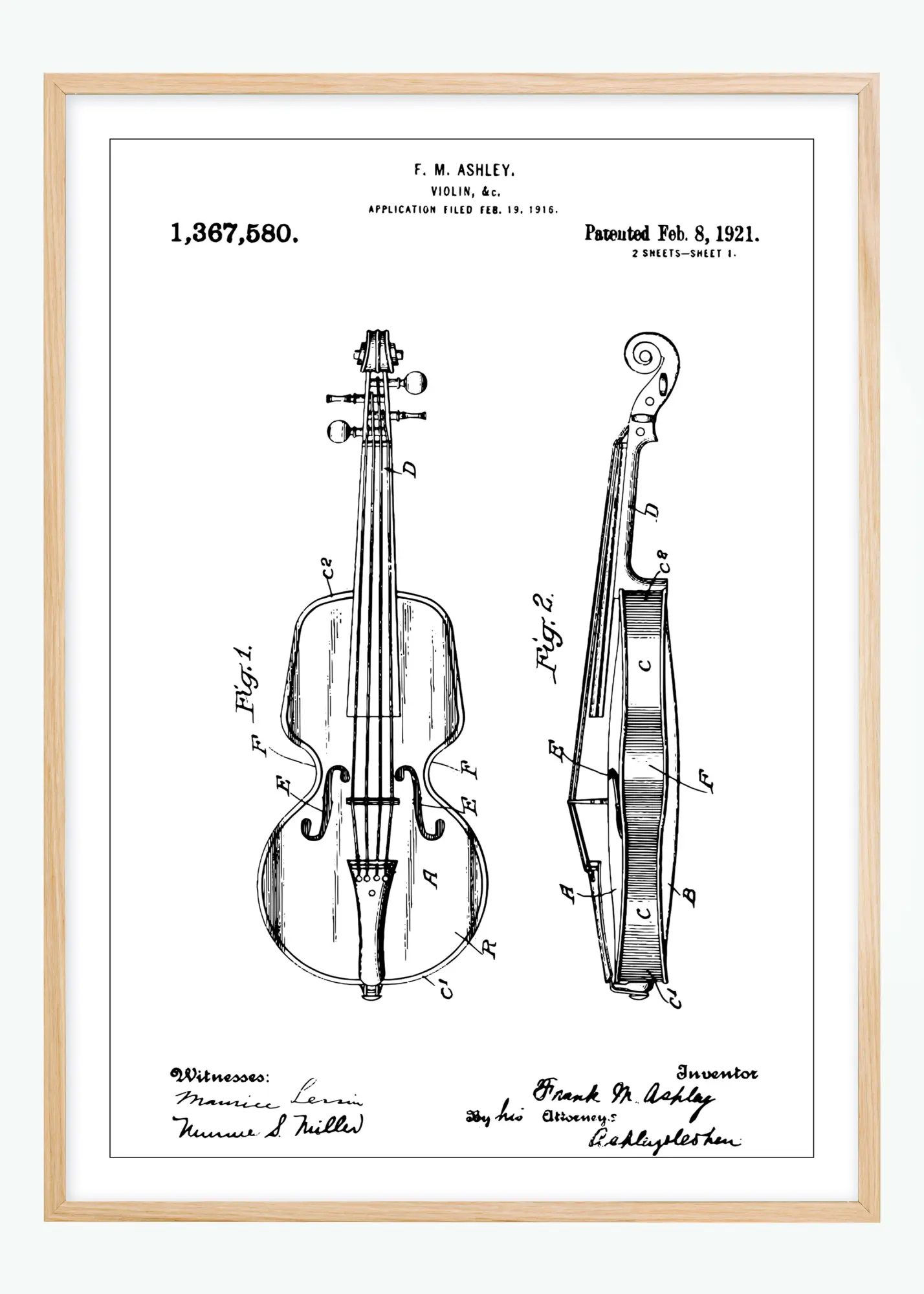 Această postare de brevet elegant concepută prezintă o invenție clasică, o vioară, din brevetul american 1,367,580. Brevetul a fost acordat pe 8 februarie 1921 inventatorului F. M. Ashley, a cărui semnătură adaugă o notă personală acestui document istoric. Cu aspectul său tradițional și atemporal, acest desen de brevet este un omagiu adus lumii muzicii și meșteșugului.