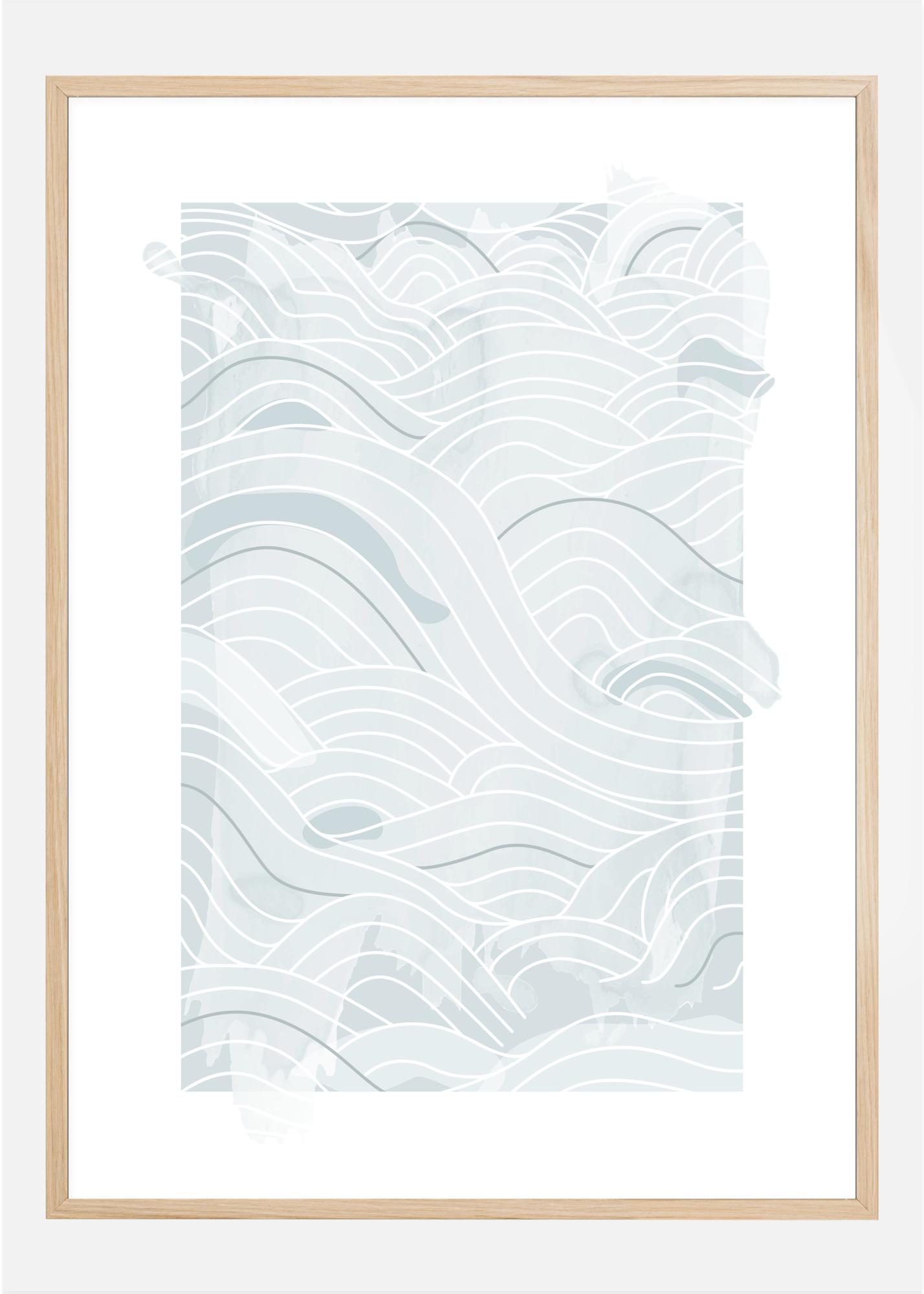 Un poster cu mare, cu linii și valuri abstracte moi albastre pe un fundal alb. Diferite nuanțe de albastru și grosimi de linie diferite sunt combinate pentru a crea aceste valuri ondulate peste pagină. Lasă-ți gândurile să rătăcească și lasă-te purtat în acest motiv de mare moale.