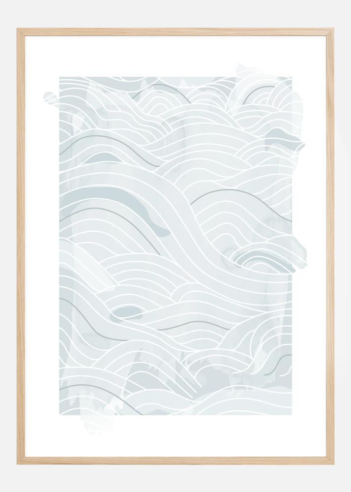 Un poster cu mare, cu linii și valuri abstracte albastre și moi, pe un fundal alb. Diferite tonuri de albastru și diverse grosimi de linii se combină pentru a crea aceste valuri unduitoare pe pagină. Lasă-ți gândurile să rătăcească și lasă-te purtat de acest model blând de mare.