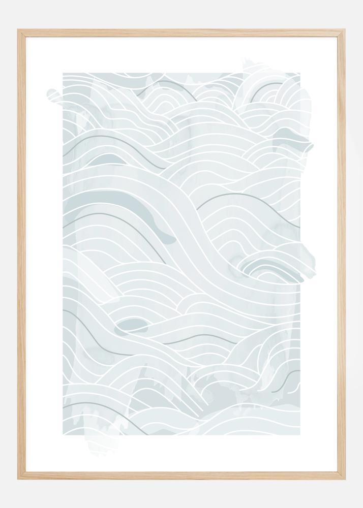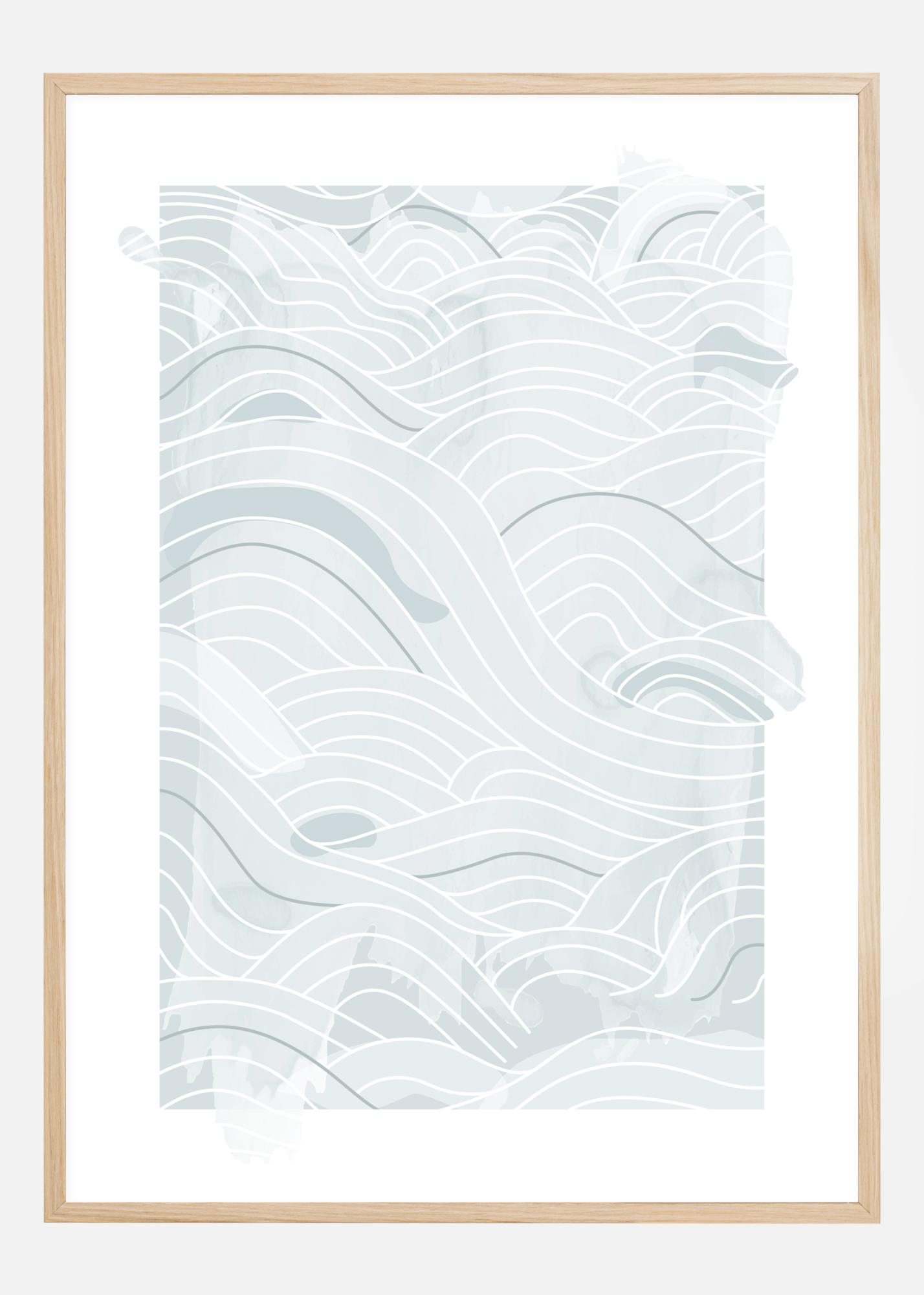 Un poster marin cu linii abstracte albastre moi și valuri pe un fundal alb. Diferite tonuri de albastru și grosimi diferite ale liniilor se combină pentru a crea aceste valuri ondulate pe pagină. Lasă-ți gândurile să hoinărească și lasă-te purtat de acest model marin blând.