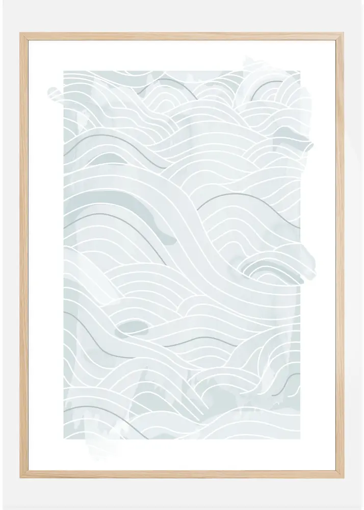 Un poster cu mare cu linii abstracte albastre moi și valuri pe un fundal alb. Diferite nuanțe de albastru și grosimi diferite ale liniilor sunt combinate pentru a crea aceste valuri unduioase pe pagină. Lasă gândurile să rătăcească și lasă-te purtat de acest model de mare liniștit.