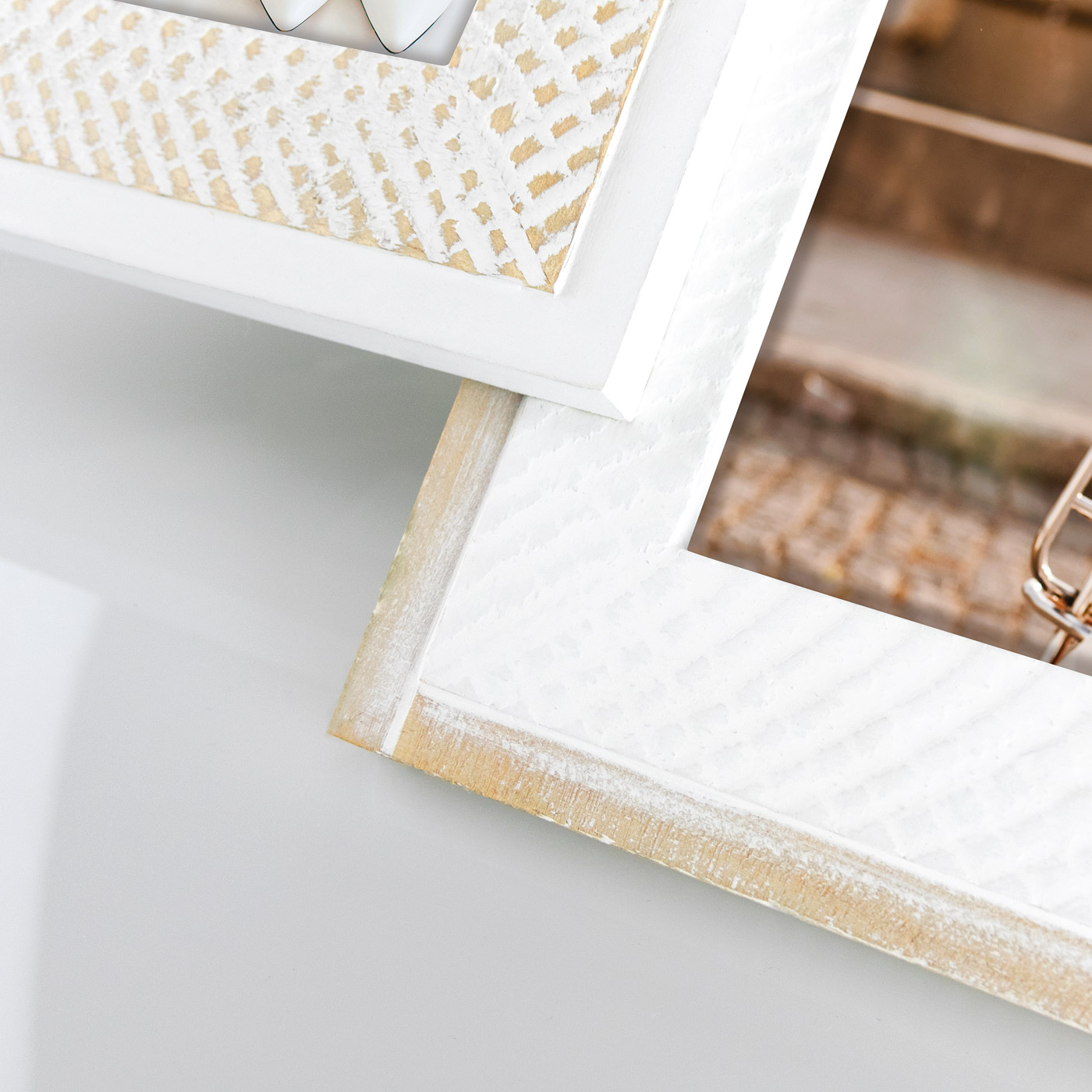 Ramă de colaj rustică în alb și lemn care încadrează elegant mai multe dintre motivele tale și devine, în același timp, un detaliu frumos în casa ta. Această ramă de colaj frumoasă are spațiu pentru 4 imagini cu dimensiunile 10x10 cm / 10x15 cm / 13x18 cm. Rama de colaj este fabricată din lemn și dimensiunile exterioare sunt de 38,8x39,8 cm. Suport de perete inclus.