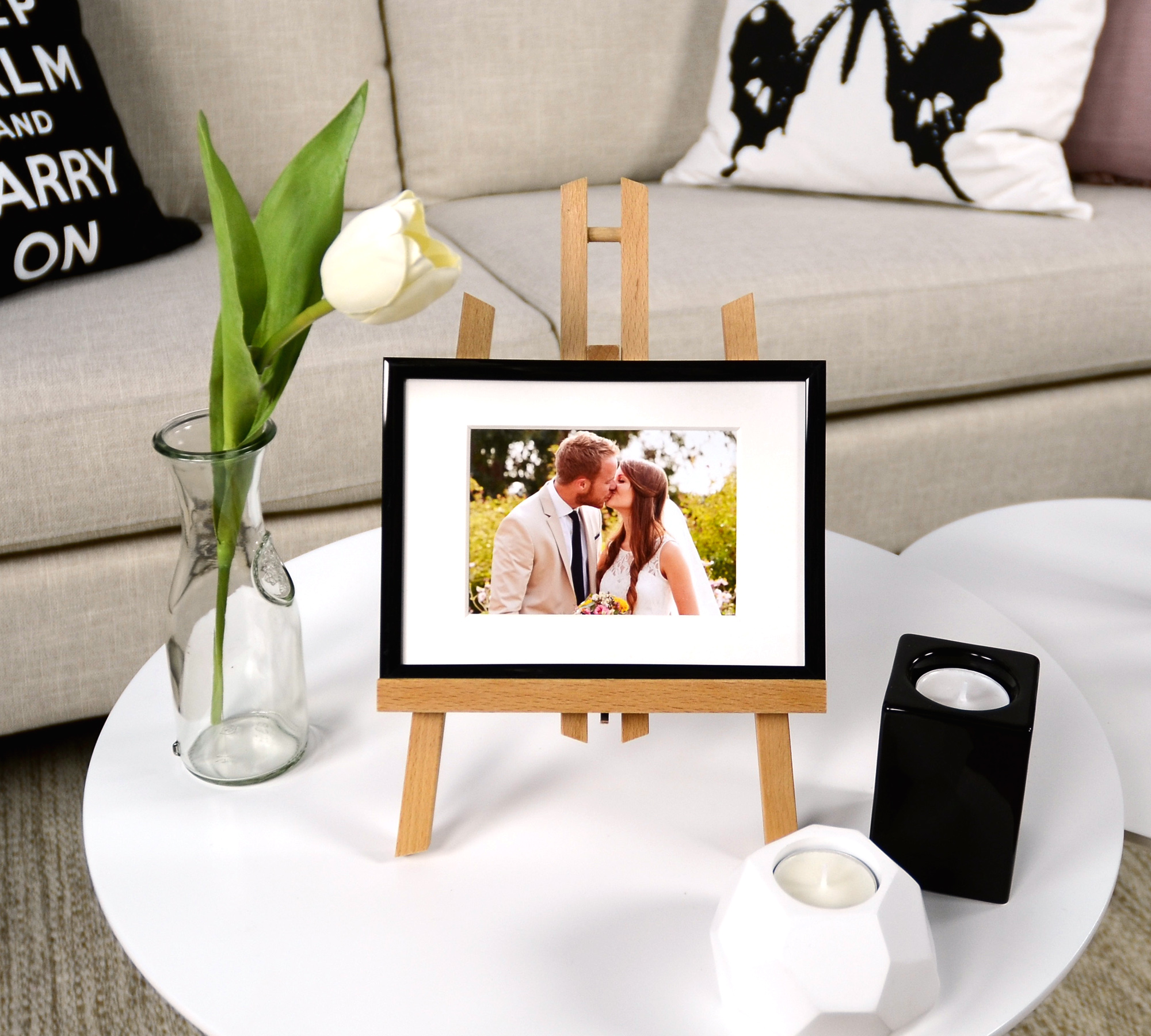 Șevalet elegant din lemn care se potrivește perfect când dorești să ai fotografiile tale încadrate în mod simplu fără a fi nevoie să le agăți pe perete.