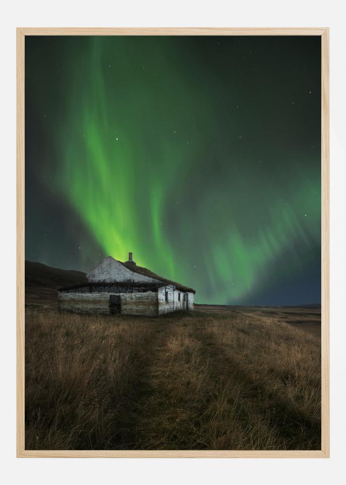 Un poster fantastic cu o auroră boreală verde deschis și galbenă peste o mică casă albă. Culorile clare ale aurorei par să se miște și să pâlpâie când te uiți la această scenă fascinantă. Admite grandoarea naturii și adu acest fenomen natural în casa ta pentru o frumusețe eterică.