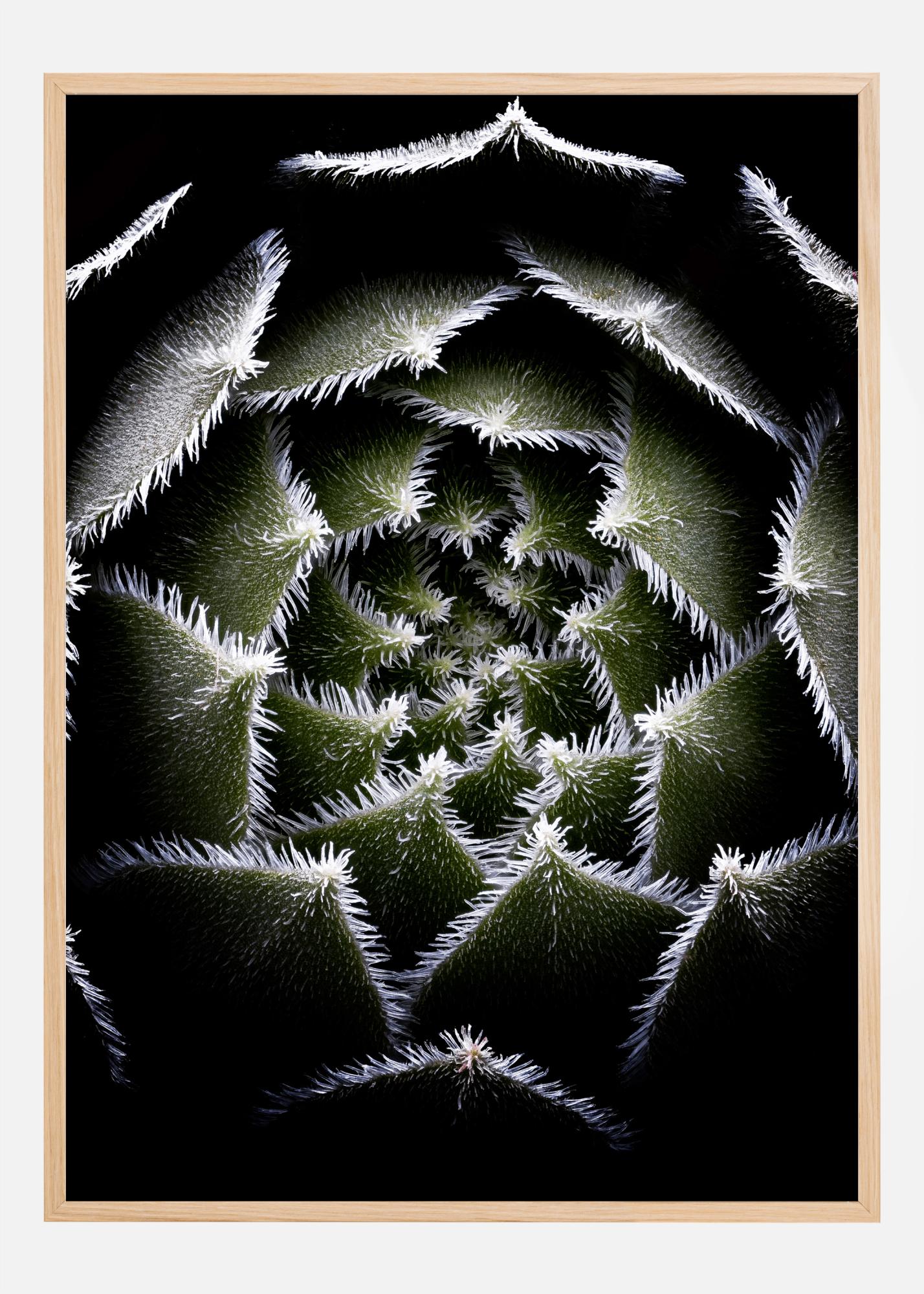 O fotografie macro a unei rozete de sempervivum. Imaginea de aproape a acestei plante arată rozeta de frunze verde intens, fiecare dintre ele fiind franjurată cu mici țepi albi. Detaliile sunt incredibile și toată lumea se va opri în fața acestui poster uimitor.