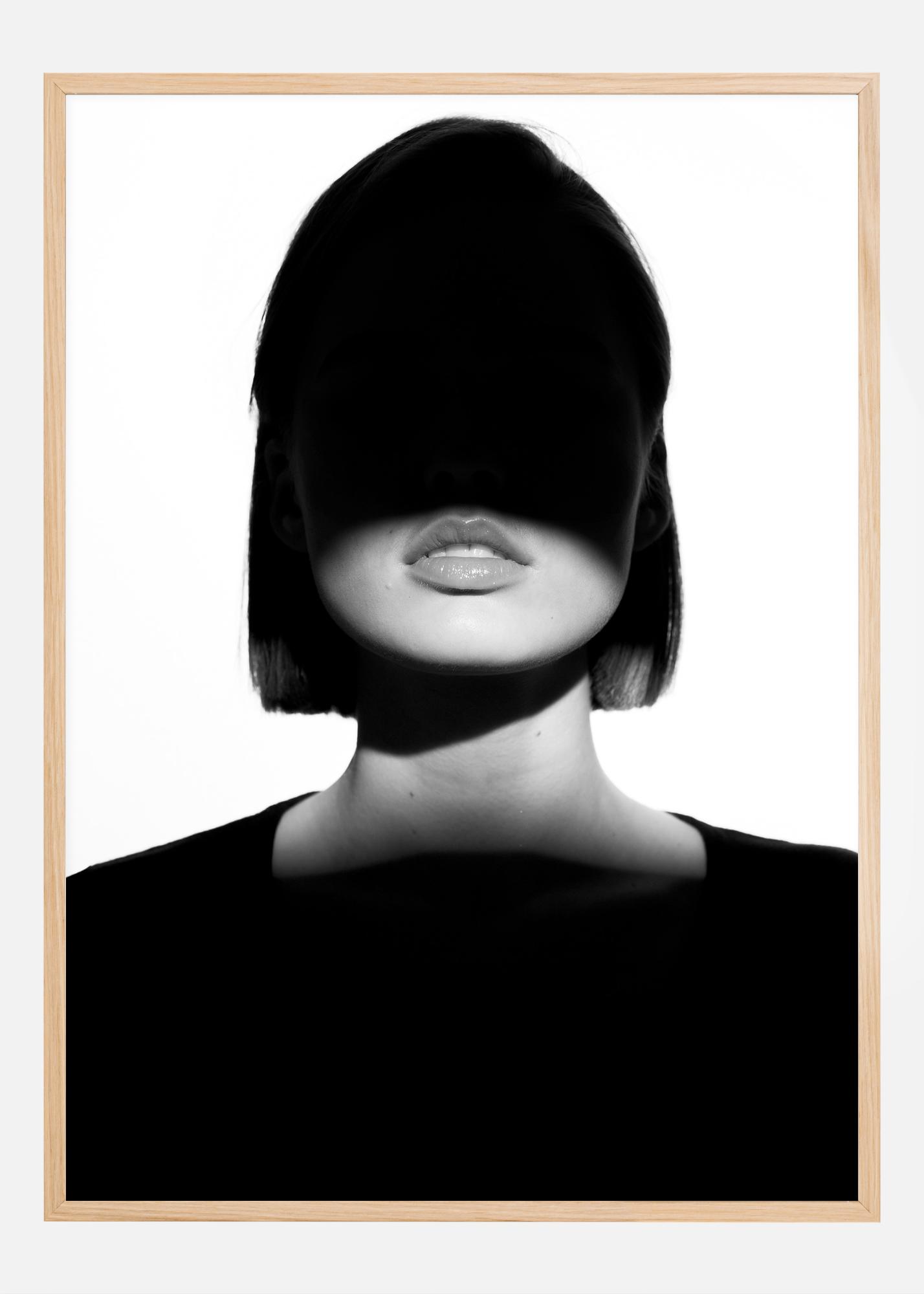 Această poster impresionantă surprinde o imagine puternică a unei femei ale cărei ochi sunt ascunși de o umbră întunecată, oferind un efect misterios și provocator de gândire. Contrastul ascuțit dintre punctele de lumină albe și tonurile negre profunde accentuează buzele ei pronunțate și trăsăturile faciale sculpturale. Este o imagine care se echilibrează pe granița dintre vizibilitate și anonimat, lumină și întuneric, și care atrage privitorul să caute înțelesuri mai profunde.