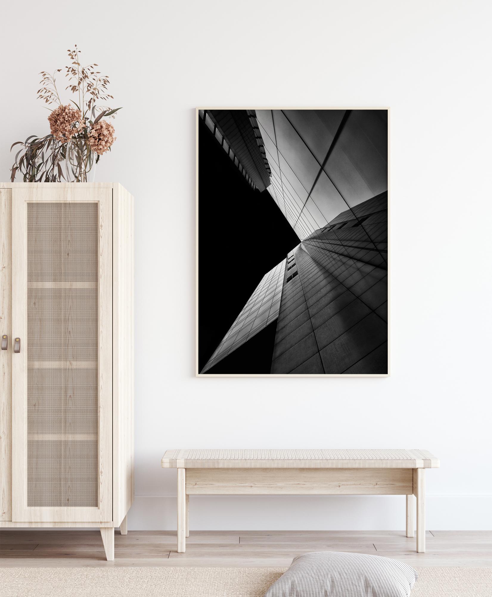 Un poster arhitectural alb-negru cu laterala unei clădiri noaptea. Liniile geometrice ale ferestrelor conduc ochiul spre punctul central al imaginii. Clădirile albe luminoase se reflectă în sticlă, iar cerul de noapte formează un contrast puternic cu laterala clădirii. Combină cu un perete colorat pentru a maximiza contrastul.