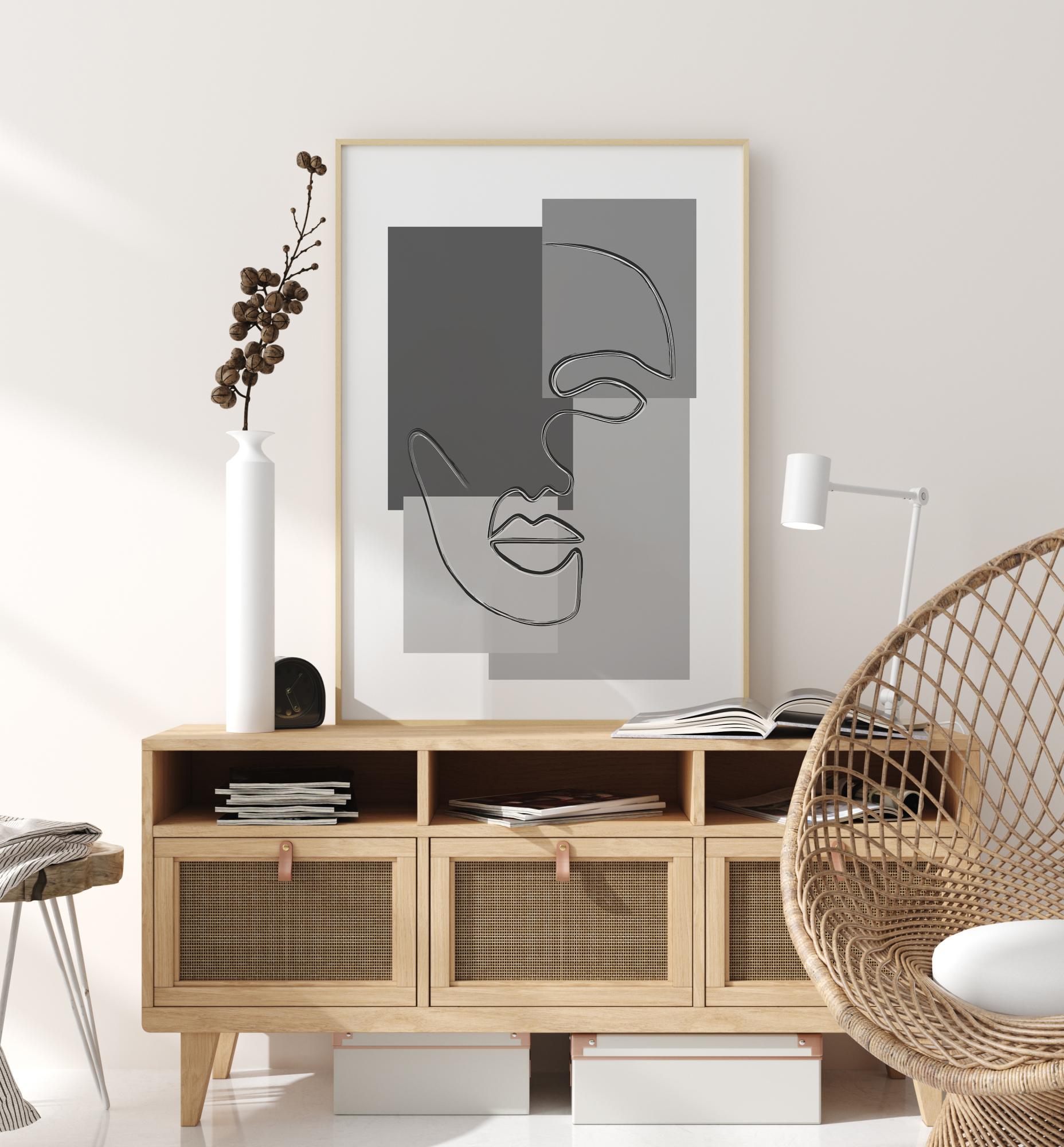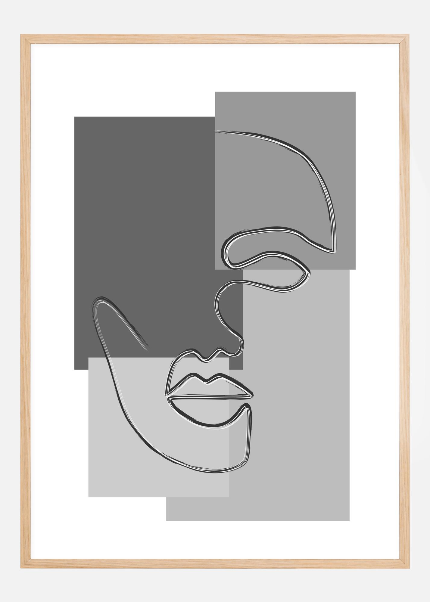 Un poster abstract cu un chip desenat deasupra a trei dreptunghiuri de culori diferite. O singură linie fluidă desenează fața de la ochi la nas și gură. Fața este așezată deasupra a patru dreptunghiuri, toate în diferite nuanțe de gri pentru un aspect mai modernist.