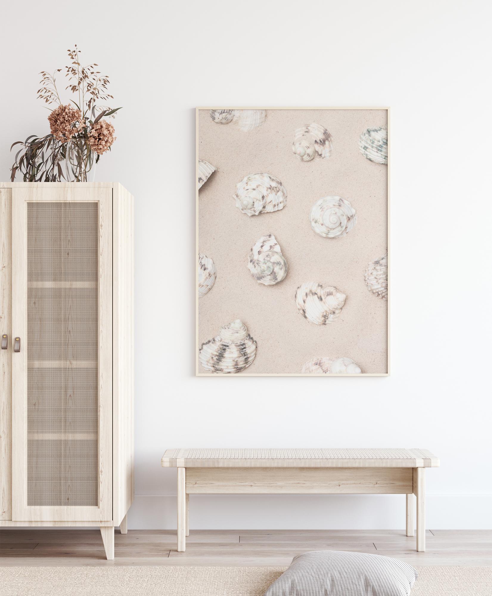 Un poster în culori pastelate cu scoici așezate pe un fundal roz deschis. Doisprezece scoici răsucite sunt așezate în diferite poziții, distribuite uniform pe întreaga imagine. Fiecare scoică este albă și maro, ceea ce oferă o imagine foarte delicată, perfectă ca un model suplimentar pe un perete simplu.