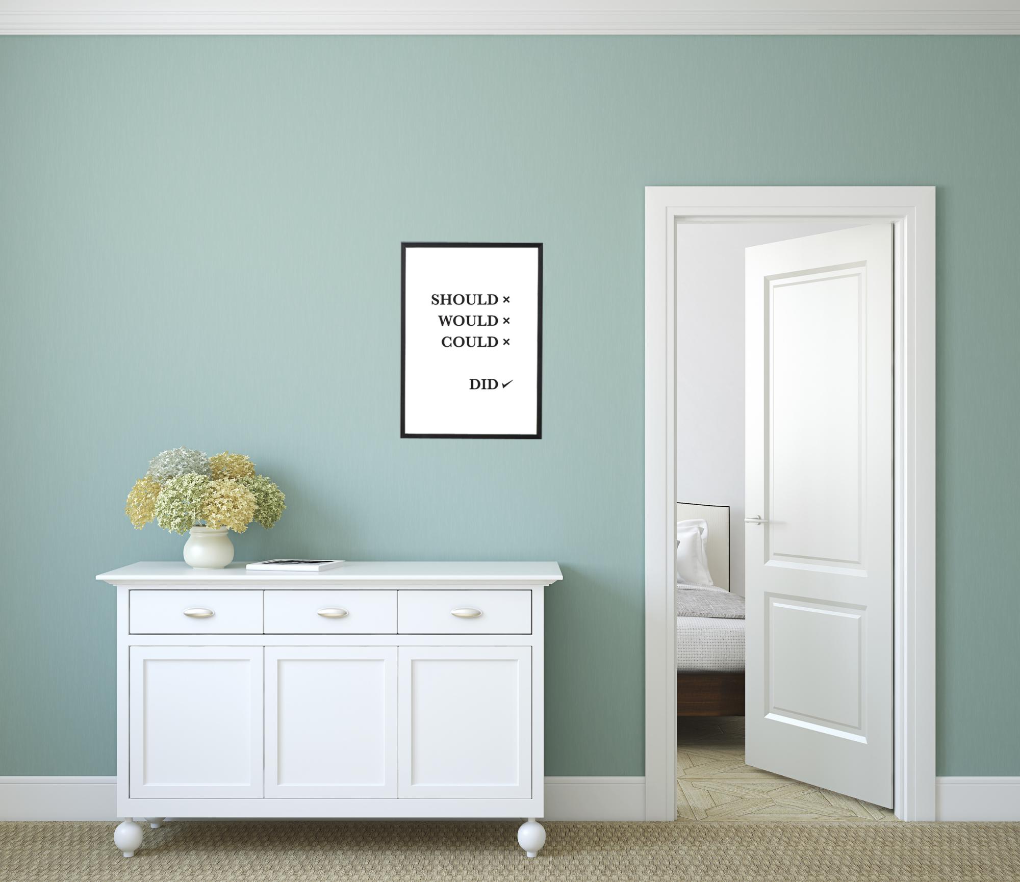 De ce să complici toate ideile tale strălucite cu gânduri inhibitoare? Nu trebuie decât să le pui în practică! Cu acest poster pe perete, nu mai există nicio scuză. Afișul este alb cu un imprimeu negru constând dintr-o listă cu textul "Should Would Could", unde fiecare cuvânt are o cruce lângă el. În partea de jos se află cuvântul "Did" cu o bifă lângă. Designul alb-negru arată foarte bine cu o ramă colorată. Deoarece posterul este disponibil în mai multe dimensiuni, vei găsi unul atât pentru birou, cât și pentru perete.