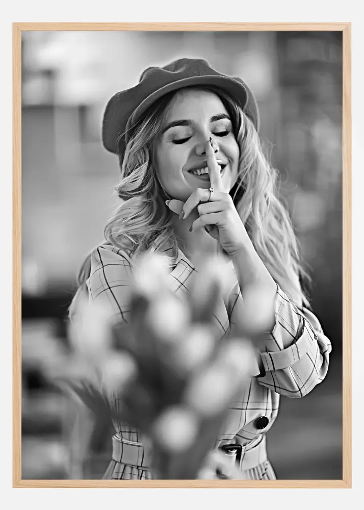 Un poster portret îndrăzneț cu o fată cu degetul la buze. Părul blond cade sub pălăria ei, iar această fată drăguță zâmbește larg în timp ce ridică un deget liniștitor la buze. Această operă alb-negru îți va îmbunătăți starea de spirit în fiecare zi când te trezești și o vezi.