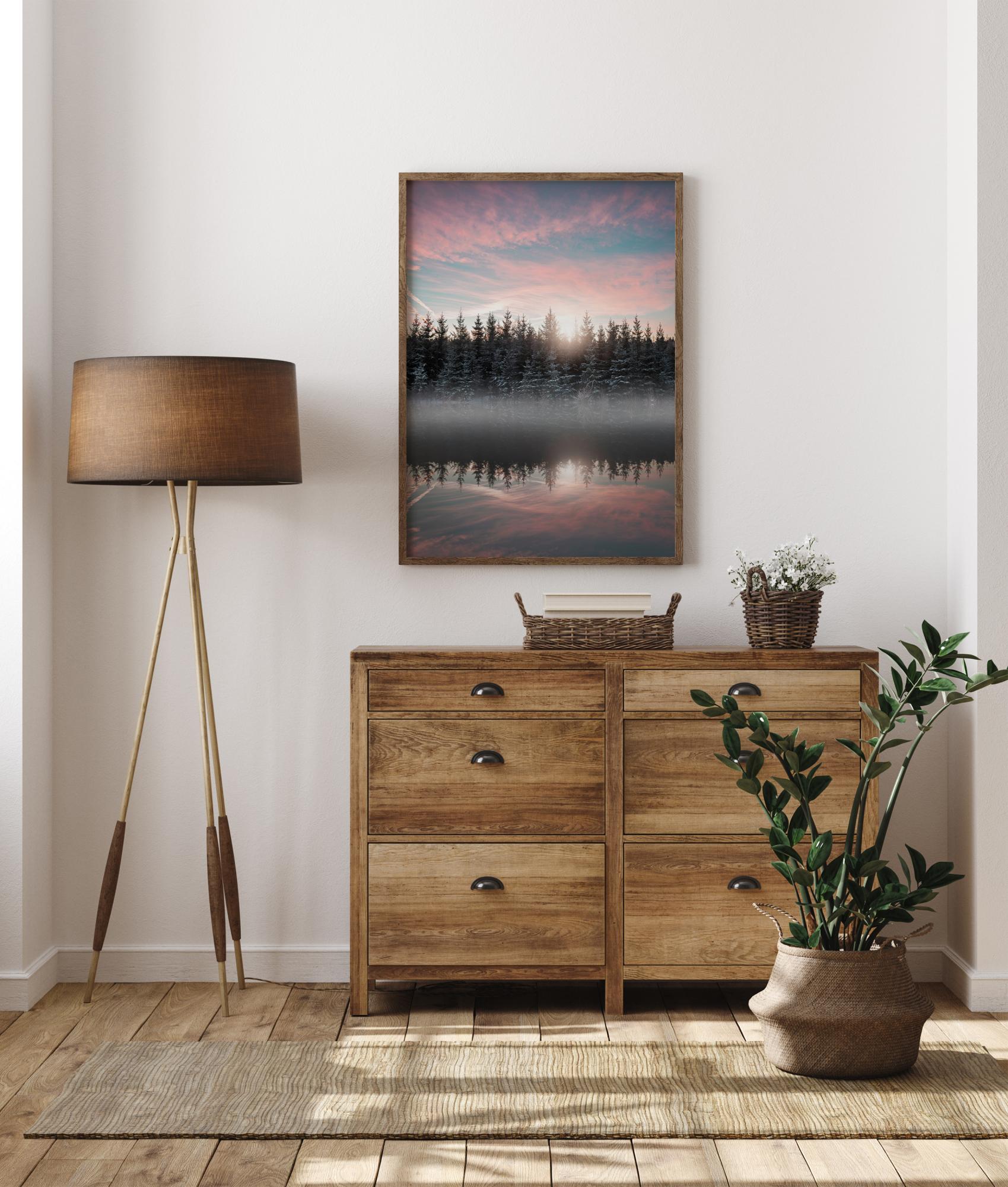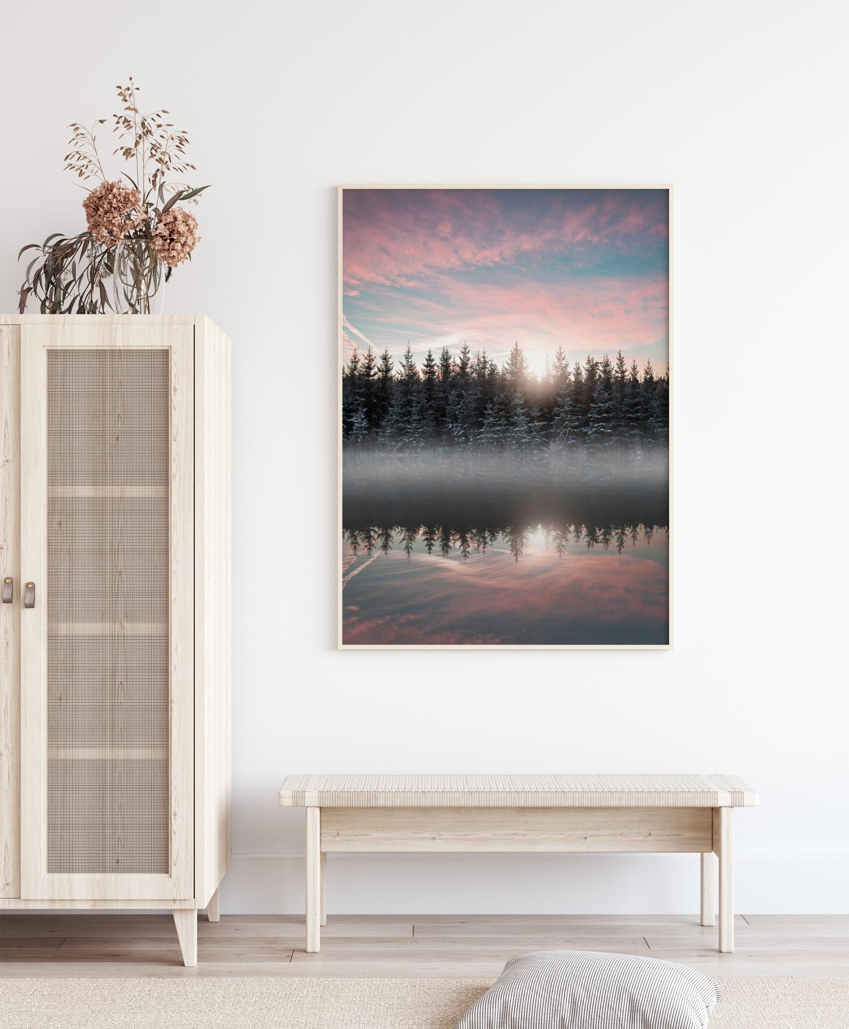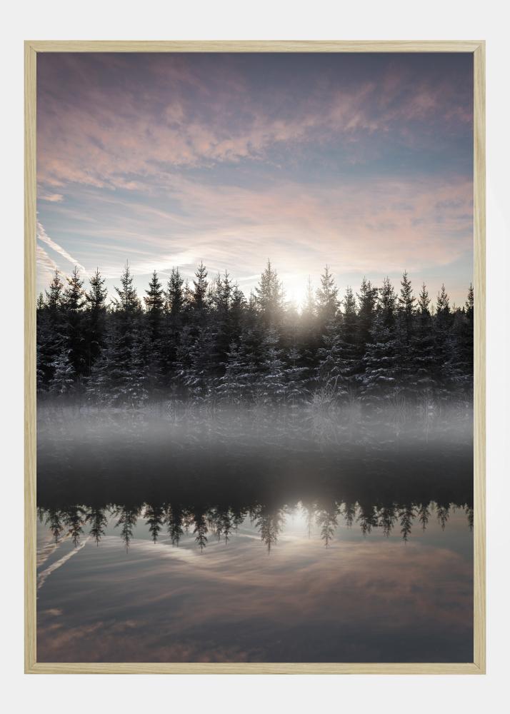 Un poster magic cu un lac învăluit în ceață în lumina dimineții. Copaci acoperiți de zăpadă stau pe mal, parțial acoperiți de ceață. Copacii se reflectă în culorile pastelate ale lacului. Deasupra vârfurilor copacilor, soarele răsare și aruncă o lumină blândă pe cerul roz și albastru, creând o atmosferă liniștită.