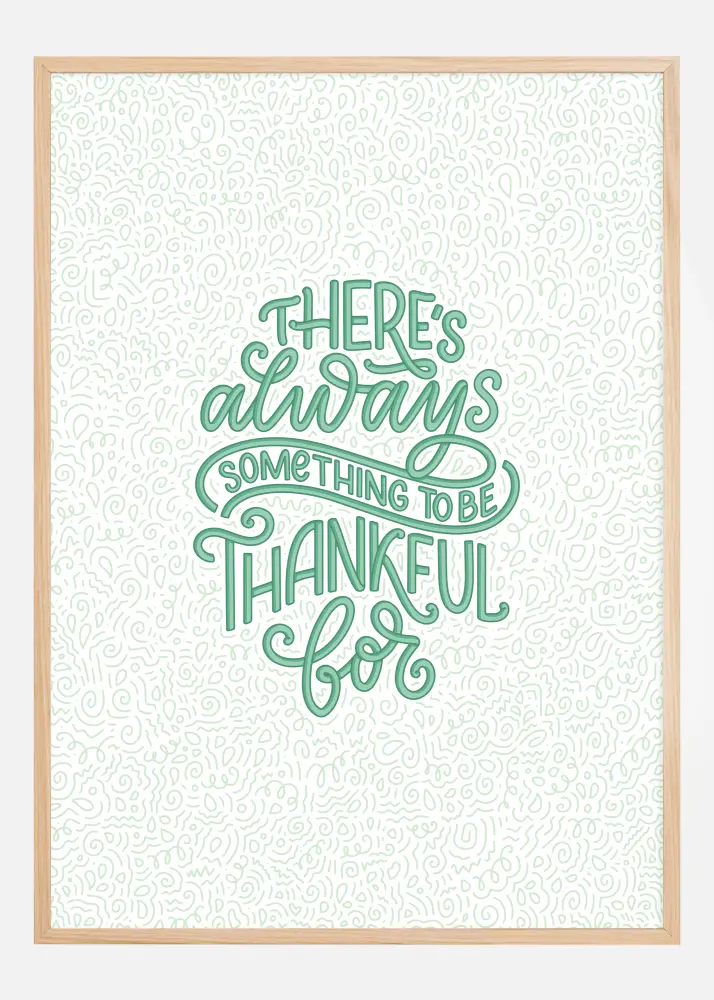 Această afișă inspiratoare este un îndemn la optimism și recunoștință, perfectă pentru a răspândi vibrații pozitive în casa sau la locul tău de muncă. Cu un text verde vibrant care spune "There's always something to be thankful for" pe un fundal alb detaliat, plin de linii și modele intricate, îndeamnă la o viziune pozitivă asupra vieții și reflecție.