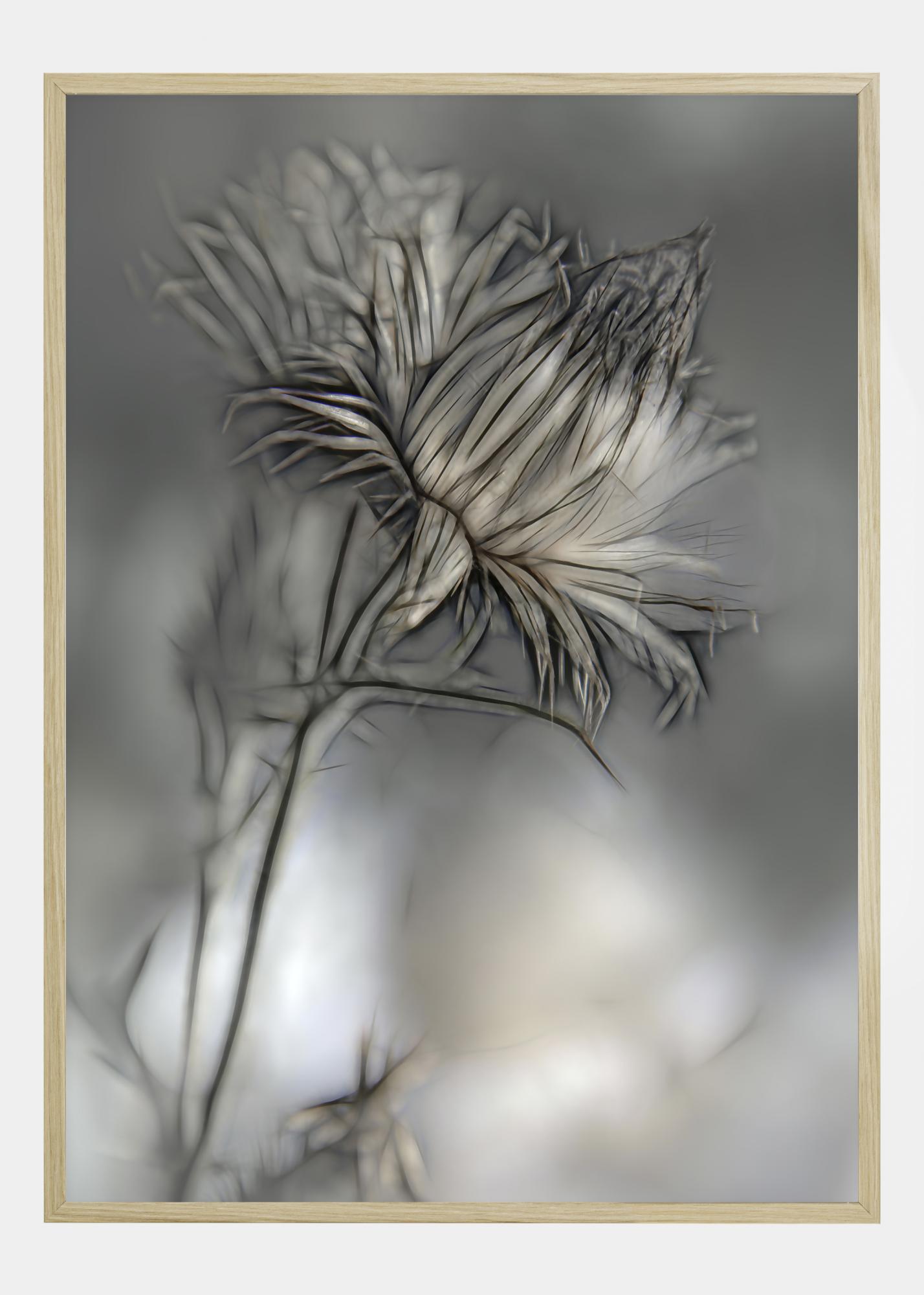 Un poster de prim-plan cu un cap de floare. Culori moi de albastru, gri și roz umplu imaginea când floarea este clar definită împotriva fundalului moale și neclar. Aproape că poți întinde mâna și culege floarea din această imagine fantastică și delicată.