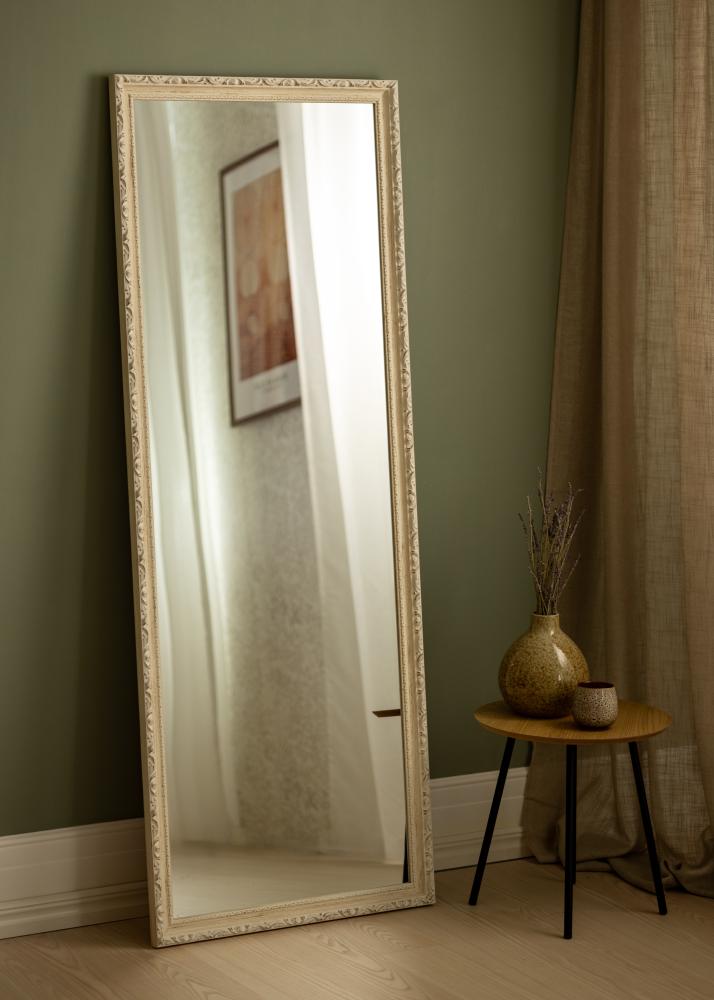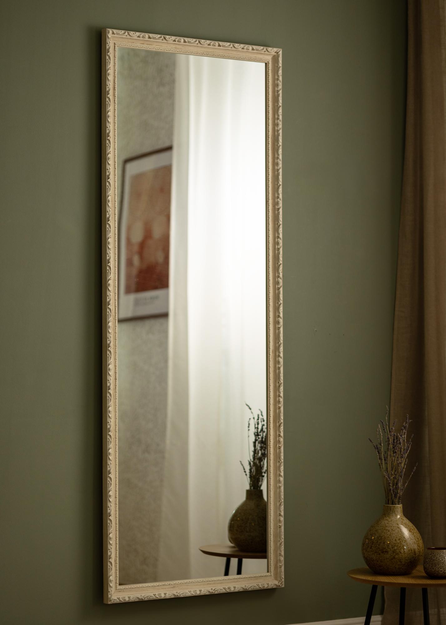 Oglindă albă în stil antic cu noduri vizibile de lemn și o lățime de 40 mm. O alegere excelentă atunci când cauți o oglindă care iese în evidență și ocupă spațiu.