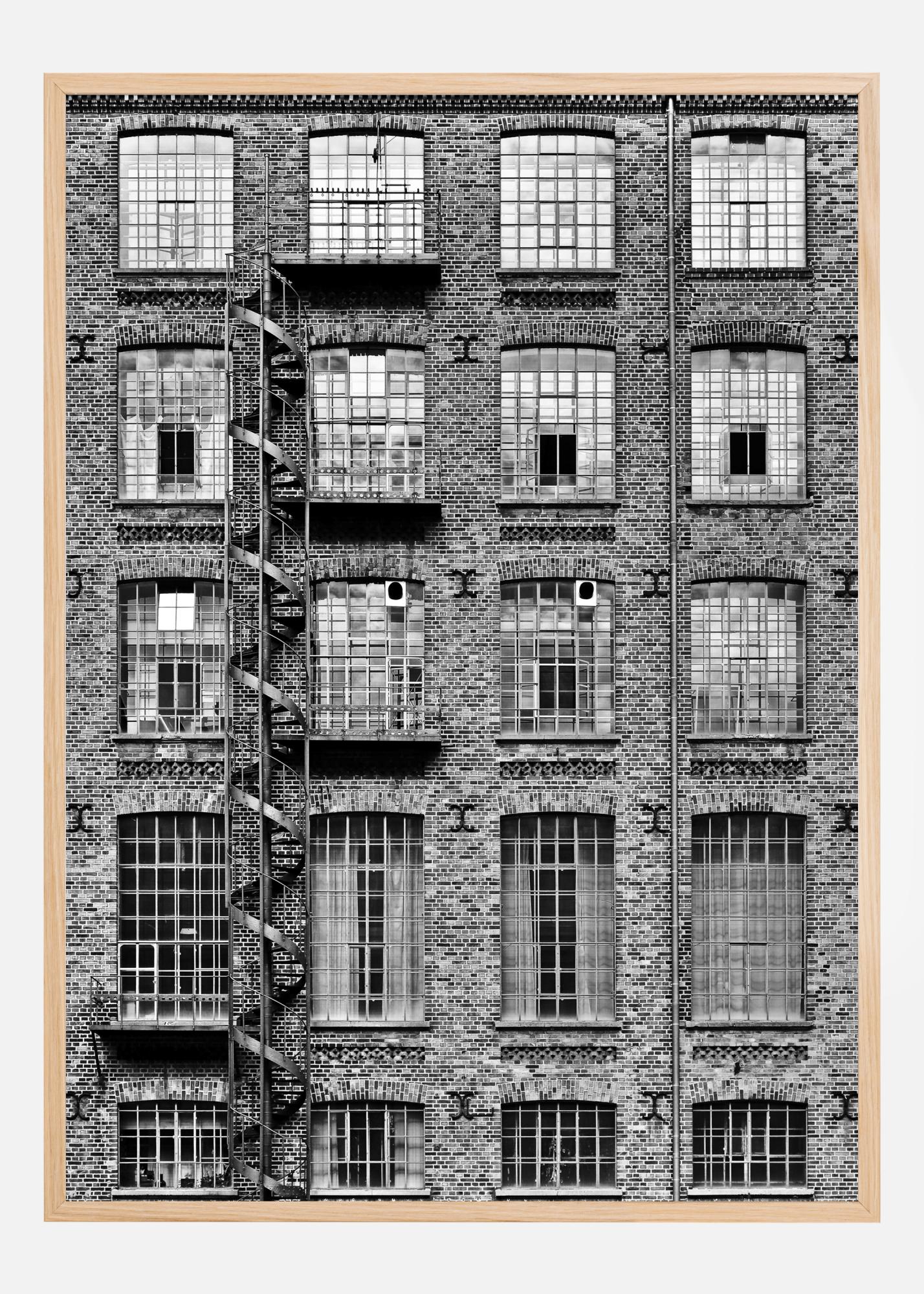 Un poster urban care arată fațada unei clădiri vechi cu o scară spiralată și meanderingă. Ferestrele pătrate și dramatice contrastează cu curbele scării. Această imprimare se potrivește excelent împreună cu formele geometrice.