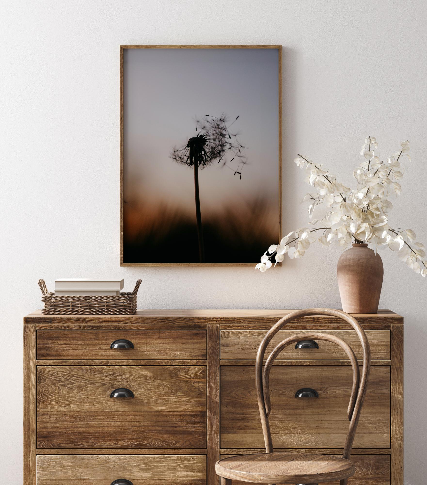 Un poster elegant cu un ceas de păpădie cu jumătate din semințe suflate. Ceasul este în siluetă în centrul imaginii. Un cer albastru face ca semințele individuale să iasă în evidență cu detalii fantastice. Iarba portocalie moale de dedesubt creează o senzație de căldură atunci când briza trece prin ea.