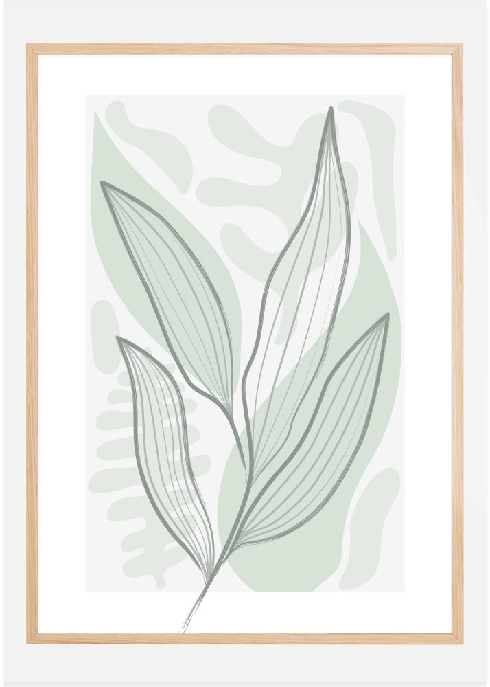 Un poster abstract cu frunze pe un fundal verde simplu cu diferite forme și modele de frunze. Cu culori verzi și gri moi, designul simplu al frunzelor, delimitat de o linie gri puternică, oferă o senzație puternică dar delicată de primăvară, care poate fi agățată în orice cameră a casei.