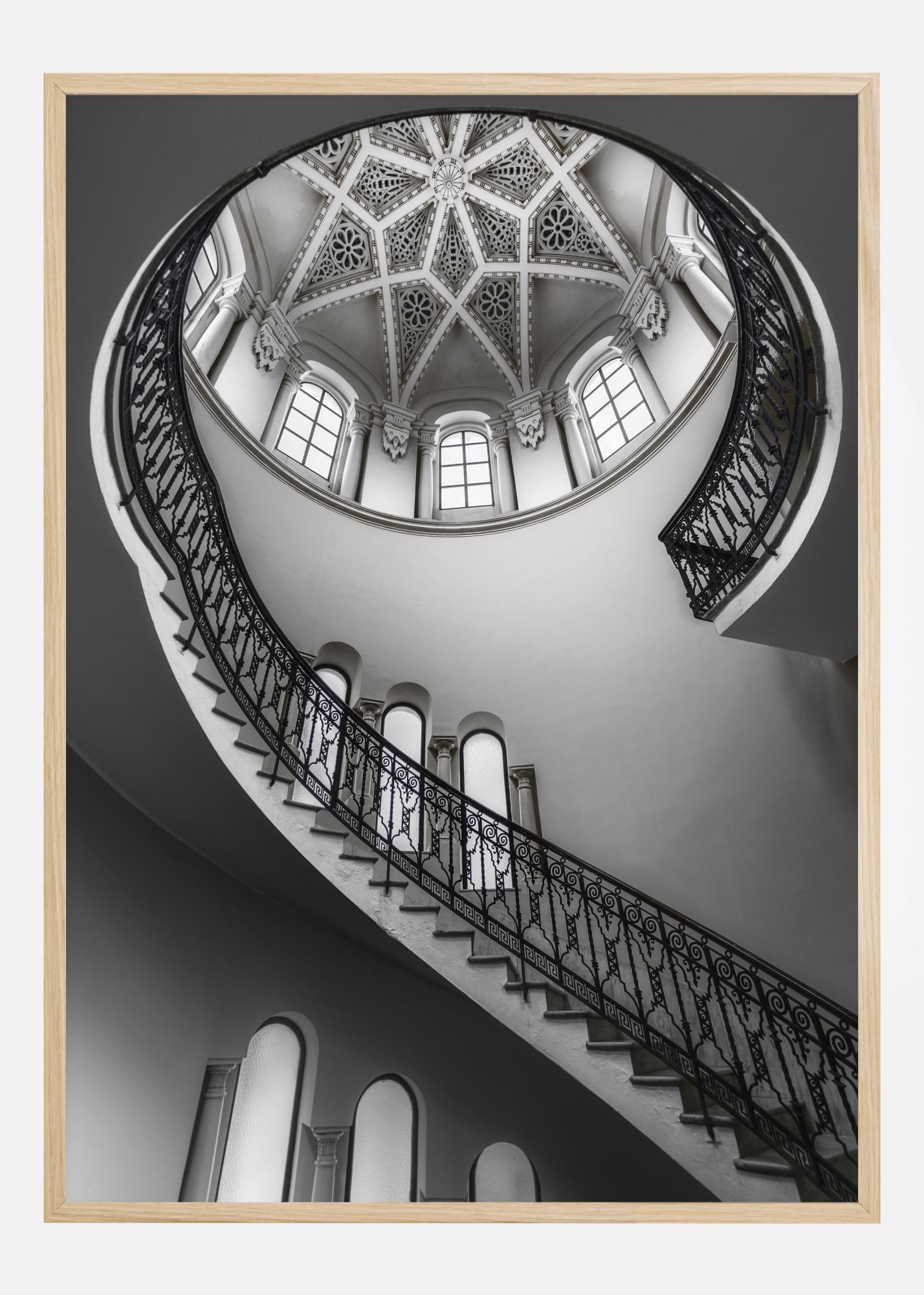 Un poster complex cu interiorul unei clădiri. O scară în spirală cu bare de fier forjat intricat se încolăcește spre tavan. Privirea este atrasă către cupola cu un design fantastic de grilaj și ferestre luminoase prin care pătrunde lumina. Eleganța și bogăția detaliilor se îmbină în această imagine alb-negru.