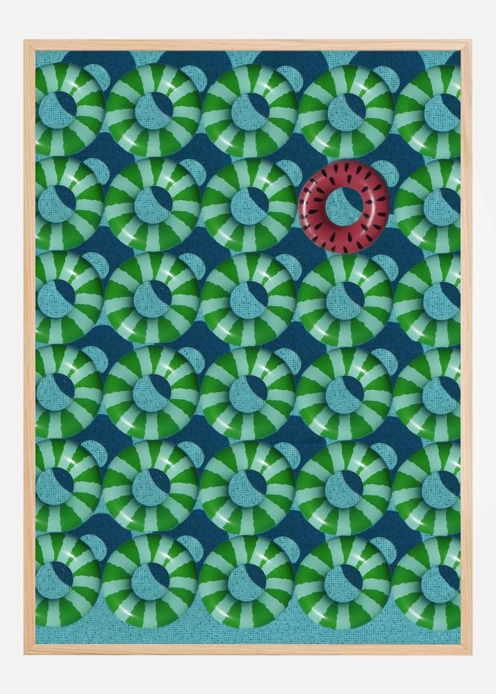 Această poster jucăușă și plină de culoare este un omagiu adus individualității și originalității. Într-o mare de colaci de înot verzi și albi identici, un singur colac de înot în formă de pepene verde atrage privirea și oferă o senzație imediată de bucurie și distracție. Acest print este un companion perfect de vară, care evidențiază unicitatea de a ieși în evidență din mulțime.