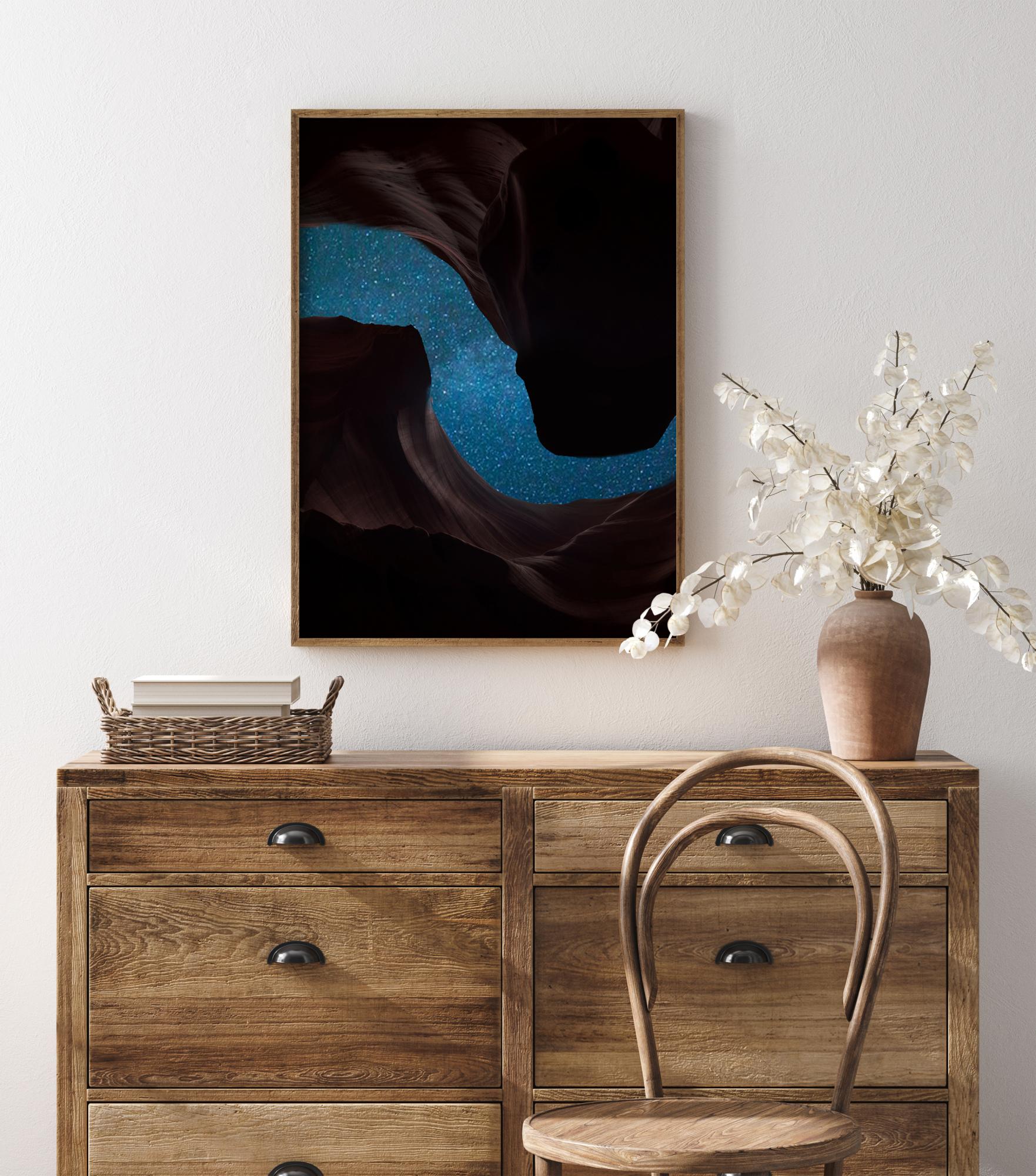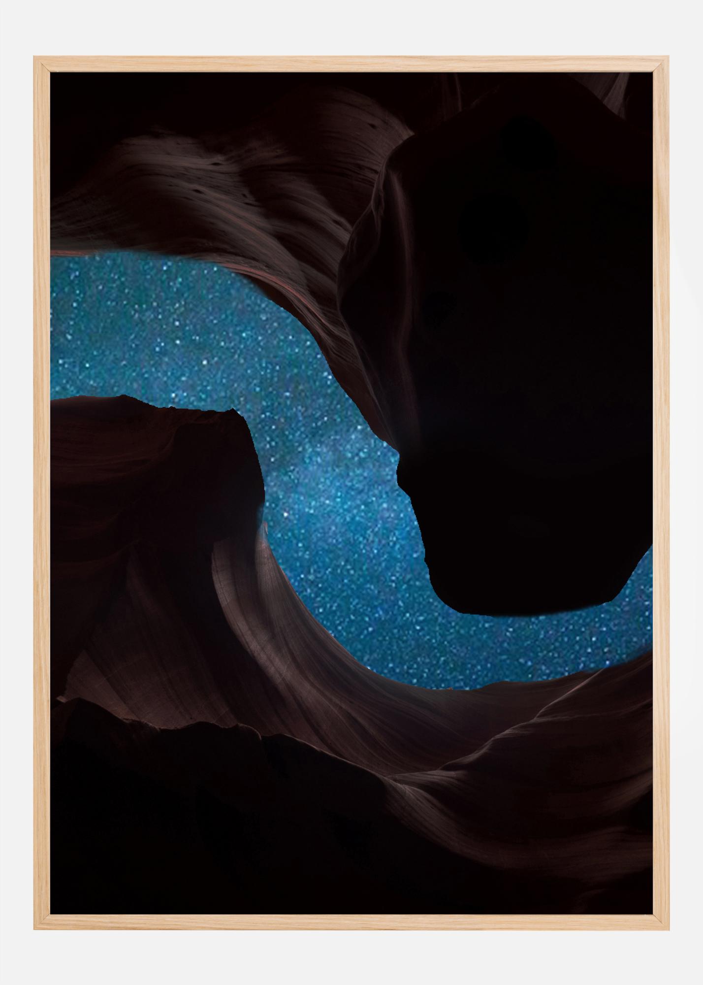 Un poster magnific de noapte cu un cer înstelat care se uită printre câteva formațiuni de stânci dramatice. Stâncile roșu închis se învârt în jurul vârfului și fundului fotografiei, creând o cale înstelată pentru ca cerul de noapte să strălucească prin această imagine vie, creată pentru a trezi admirație.