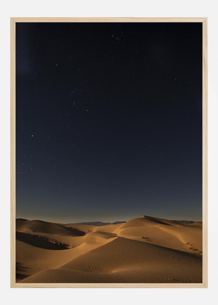 Un poster sugestiv cu deșertul noaptea. Dunele de nisip aurii moi se întind în depărtare în partea de jos a imaginii. Deasupra nisipului se întinde un cer albastru închis enorm cu stele moi răspândite peste el. Creează o senzație de spațiu atunci când agăți acest poster acasă.