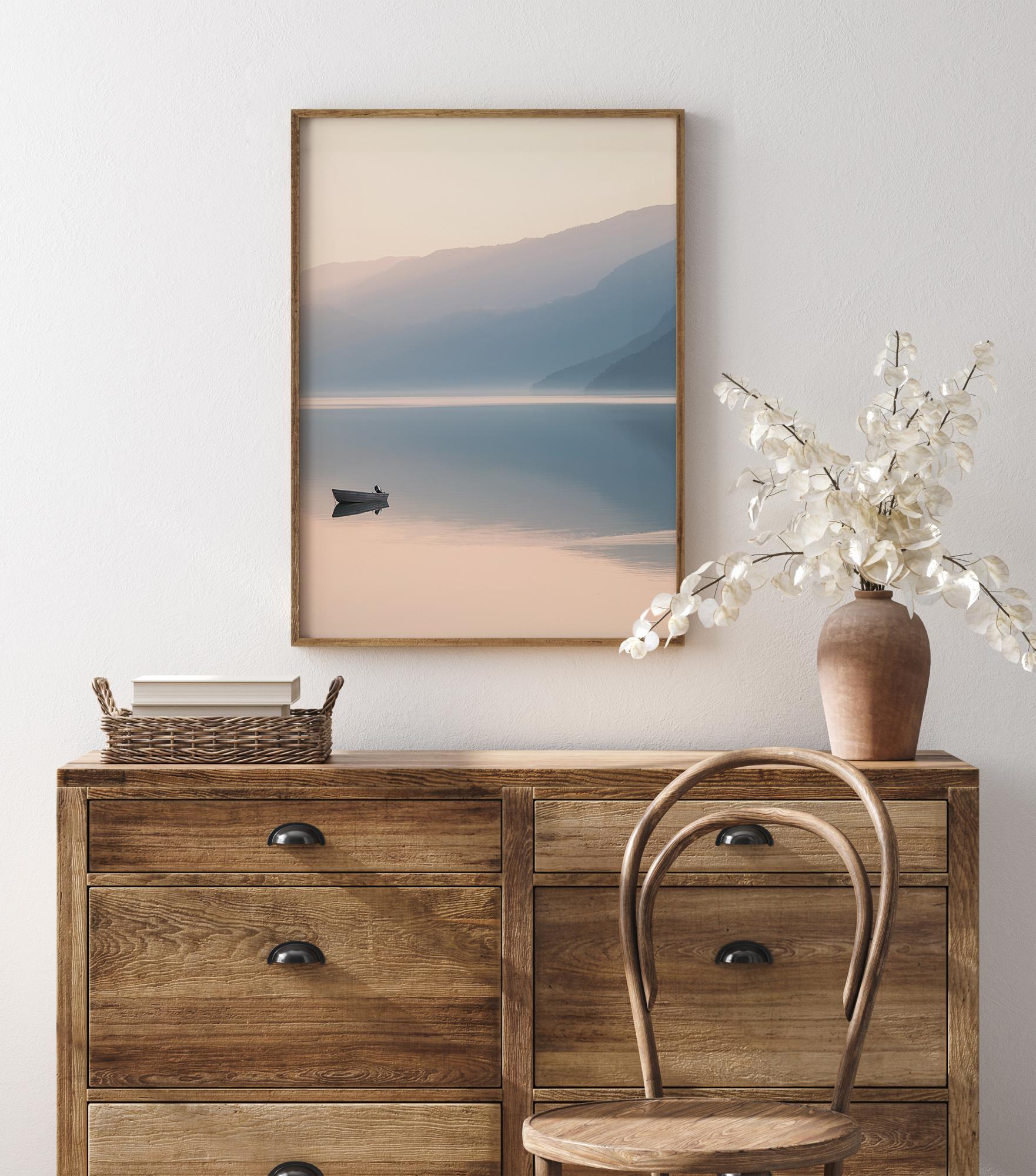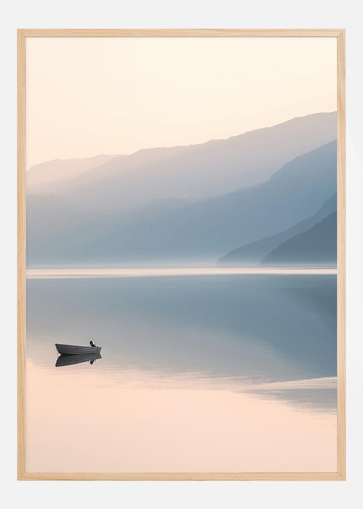 Un poster liniștit cu o barcă în mijlocul unui lac mare. Această imagine de seară nu este altceva decât calmă. Un lac liniștit reflectă albastrul pastelat din munții din spate pentru a crea o liniște și odihnă care va pătrunde chiar și în casa ta.