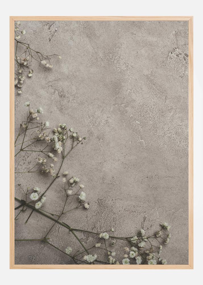 Un poster natural cu tulpini de plante înflorite împrăștiate pe o podea de piatră. Florile albe moi și tulpinile lor mai întunecate se potrivesc cu modelele din podeaua texturată gri deschis. O combinație de elemente moi și dure poate fi văzută aici, creând această imagine captivantă.