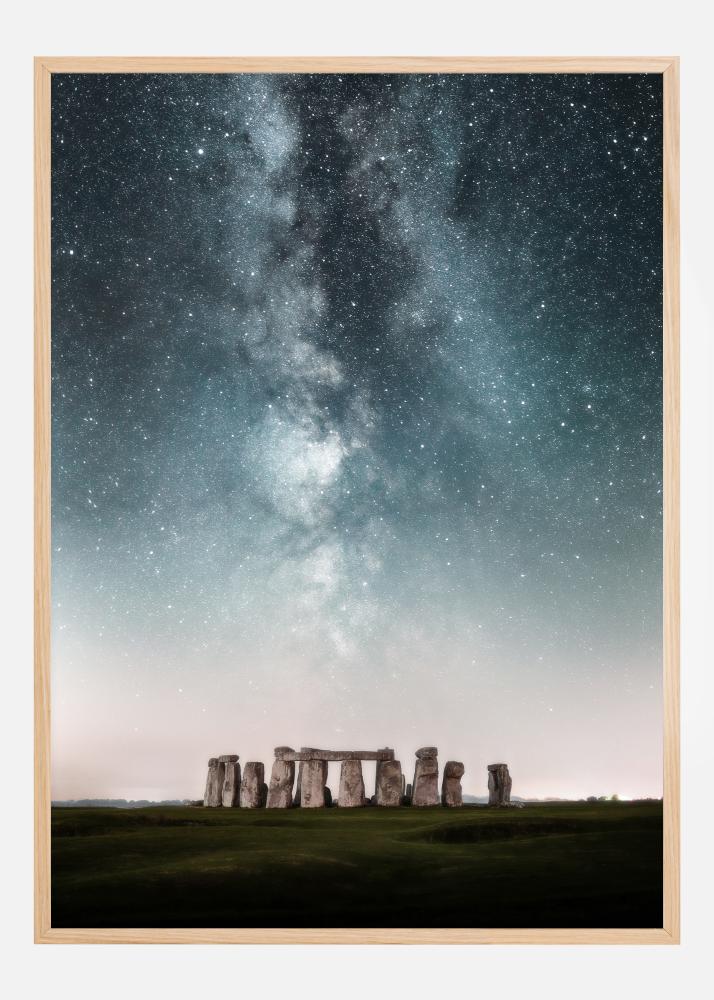 Un poster faimos cu Stonehenge împotriva unui cer dramatic plin de stele. Această imagine largă se concentrează pe impresionanta Cale Lactee care se întinde pe cerul albastru plin de stele. Urmărește galaxia în jos până vezi Stonehenge ca o mică formațiune de piatră în partea de jos a imaginii pentru a obține o altă perspectivă asupra acestei minunate minuni a lumii.