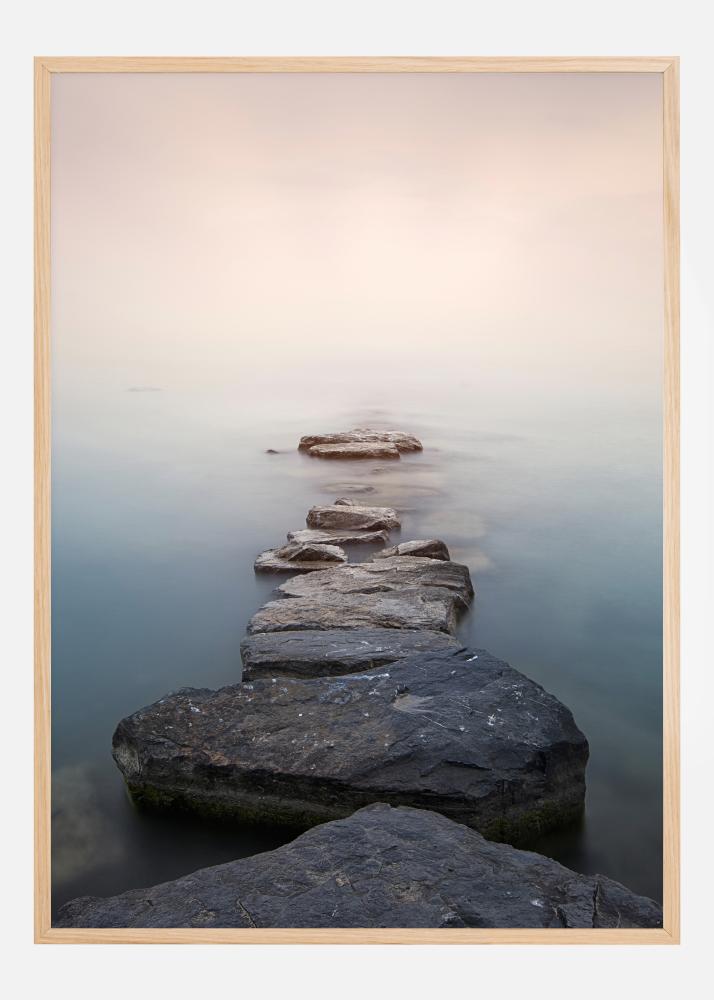 Un poster eteric cu pietre care conduc peste un lac spre necunoscut. Pietre mari duc către o lume cețoasă dincolo. Culorile moi de albastru și roz umplu această imagine cu o atingere magică delicată. Fă primul pas și vezi unde te duc picioarele.