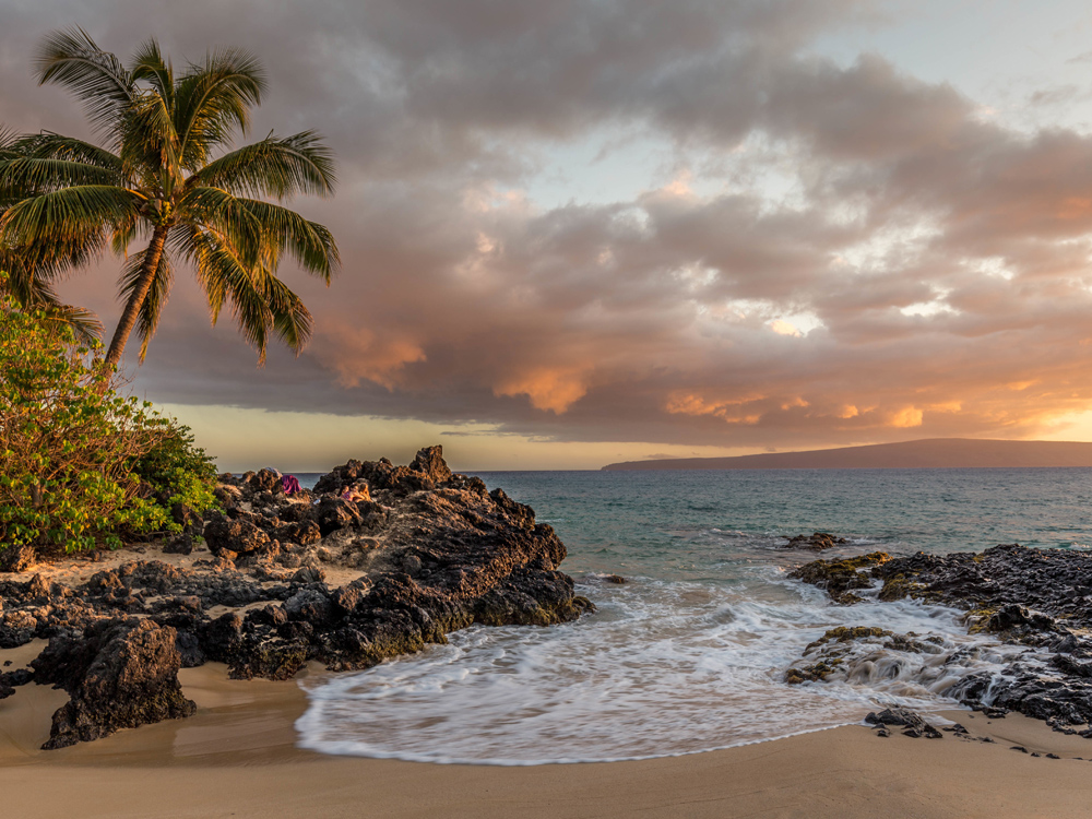O plajă la apus, un frumos clișeu care este un must-have pentru pasionații de tiki sau pentru tema tropicală. Poster cu palmierul clasic care se apleacă peste marginea plajei în ultimele raze de soare aurii ale zilei. Fotografia arată bine într-o ramă cu un aspect uzat sau într-o culoare puternică pentru a se potrivi cu decorul tiki.