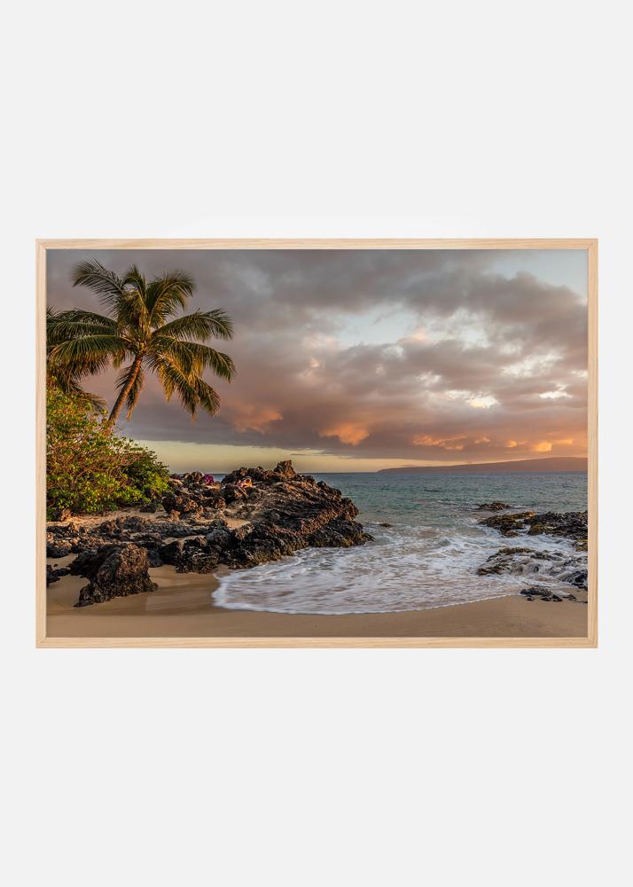 O plajă la apus, un clișeu frumos care este obligatoriu pentru pasionații de tiki sau tema tropicală. Poster cu palmierul clasic care se înclină peste marginea plajei în ultimele raze aurii ale zilei. Fotografia arată bine într-o ramă cu aspect uzat sau într-o culoare puternică pentru a se potrivi cu decorul tiki.