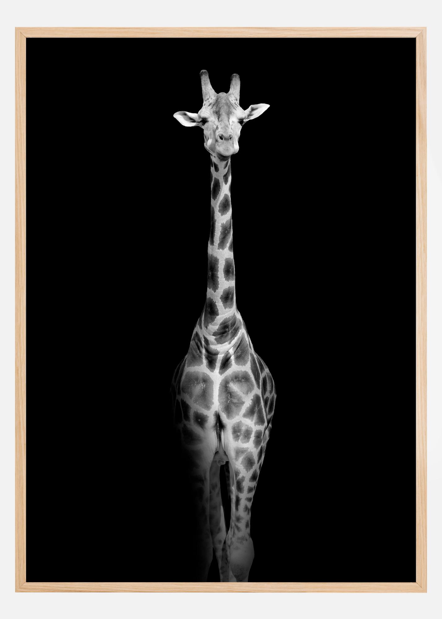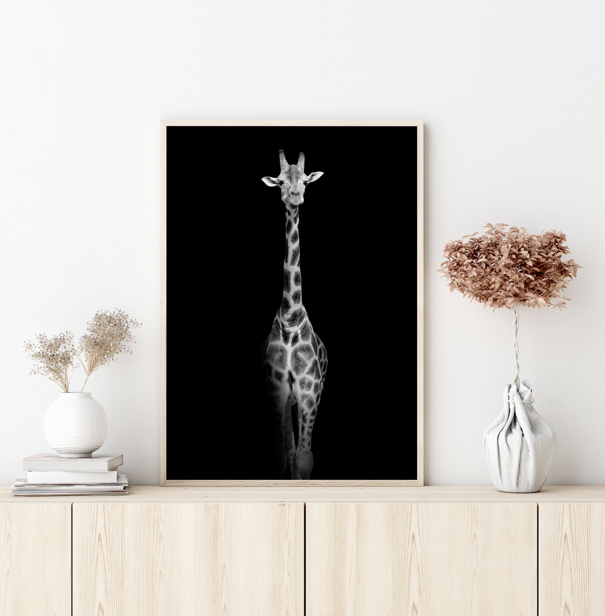 Artă fotografică în alb-negru a unei girafe impunătoare care pășește din fundalul negru al imaginii. Un poster elegant și plin de contrast cu o adâncime minunată. Potriviți-l cu alte postere cu animale frumoase din stilul nostru pentru un perete de tablou în același temă.